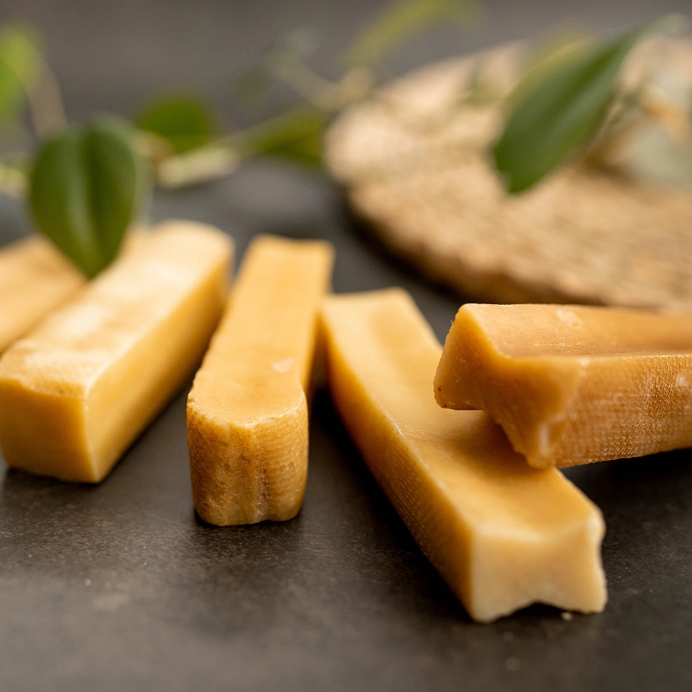 Traditioneel gedroogde en gerookte Himalayische kaas staat bekend om zijn hoge hardheid, die langdurig kauwplezier en natuurlijke tandverzorging biedt.