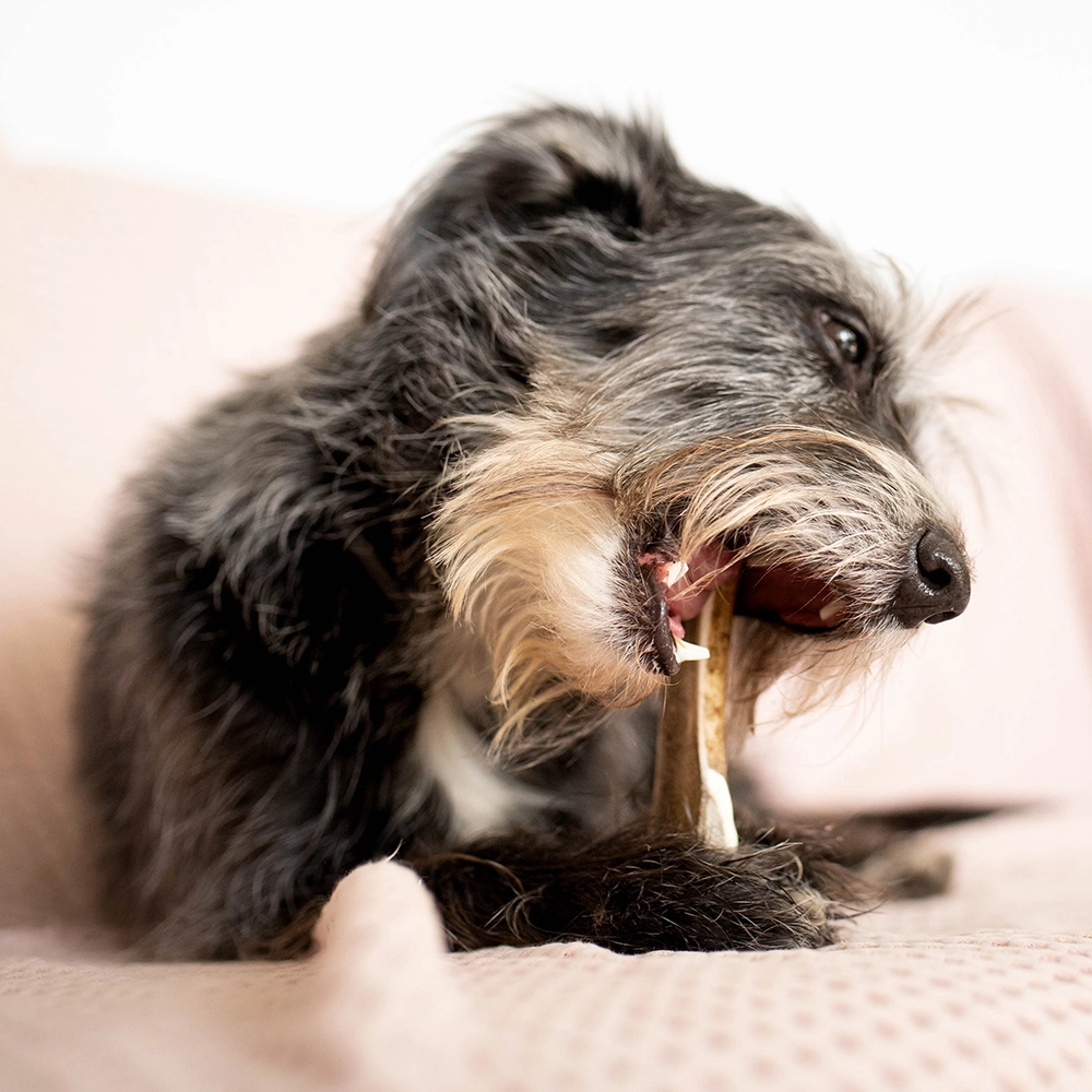 Aanbeveling: Houd je hond tijdens het kauwen altijd in de gaten en vervang het product op tijd zodra het te klein wordt en er kans is op inslikken.