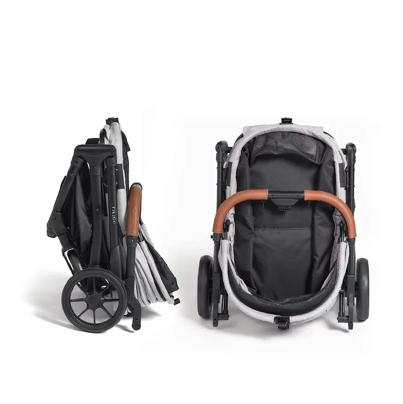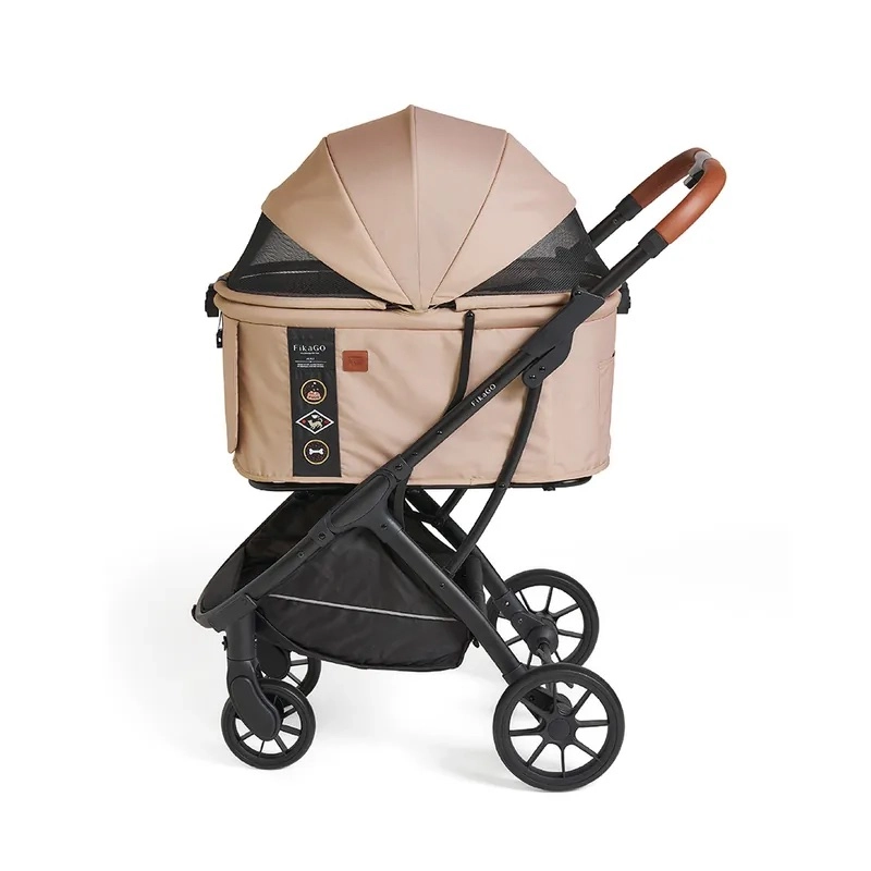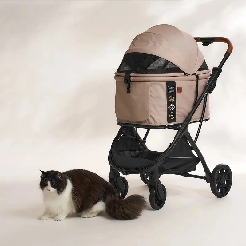 De FIKAGO Agile Huggy in beige is een doordachte huisdierenwagen voor katten en honden, die stijl, gebruiksgemak en veiligheid combineert. Dankzij het lichte aluminium frame en het snel inklappen met één hand berg je hem eenvoudig op in de kofferbak; na het inklappen blijft hij zelfstandig staan. De extra grote bak biedt maximaal comfort, terwijl de waterdichte kap van gerecyclede materialen beschermt tegen zon en stof.