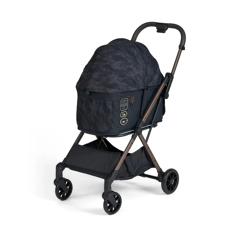 Dankzij het inklappen met één hand maak je de wagen snel klaar voor gebruik of opslag. Vering, grotere achterwielen en lekbestendige banden zorgen voor een soepele rit in de stad en in het park. Praktische details zoals een veiligheidspolsband, one-touch rem, houder voor pee pad en antislip-elementen verhogen de veiligheid en hygiëne onderweg.