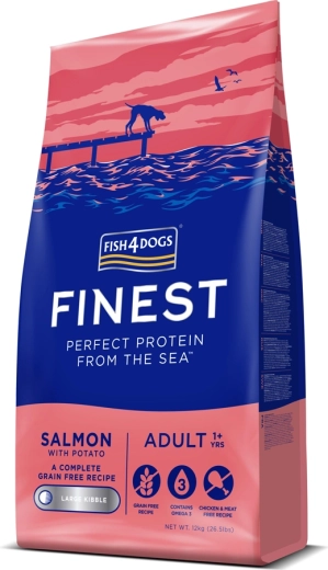 De uitgebalanceerde droge voeding van Fish4Dogs voor grote volwassen honden is gebaseerd op een eersteklas bron van dierlijke eiwitten – Noorse zalm. De combinatie van zalm en aardappelen zorgt voor uitstekende verteerbaarheid, natuurlijke smakelijkheid en een optimale verhouding aan voedingsstoffen voor dagelijkse vitaliteit.