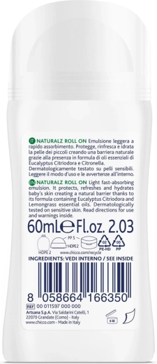 De lichte en snel intrekkende roller van Chicco biedt milde bescherming tegen muggen, verfrist aangenaam en hydrateert de kinderhuid. Dankzij de essentiële oliën van eucalyptus en citroengras creëert het een natuurlijke barrière, is het dermatologisch getest op de gevoelige huid en geschikt voor kinderen vanaf 2 maanden. Zonder alcohol, tot wel 97% ingrediënten van natuurlijke oorsprong.