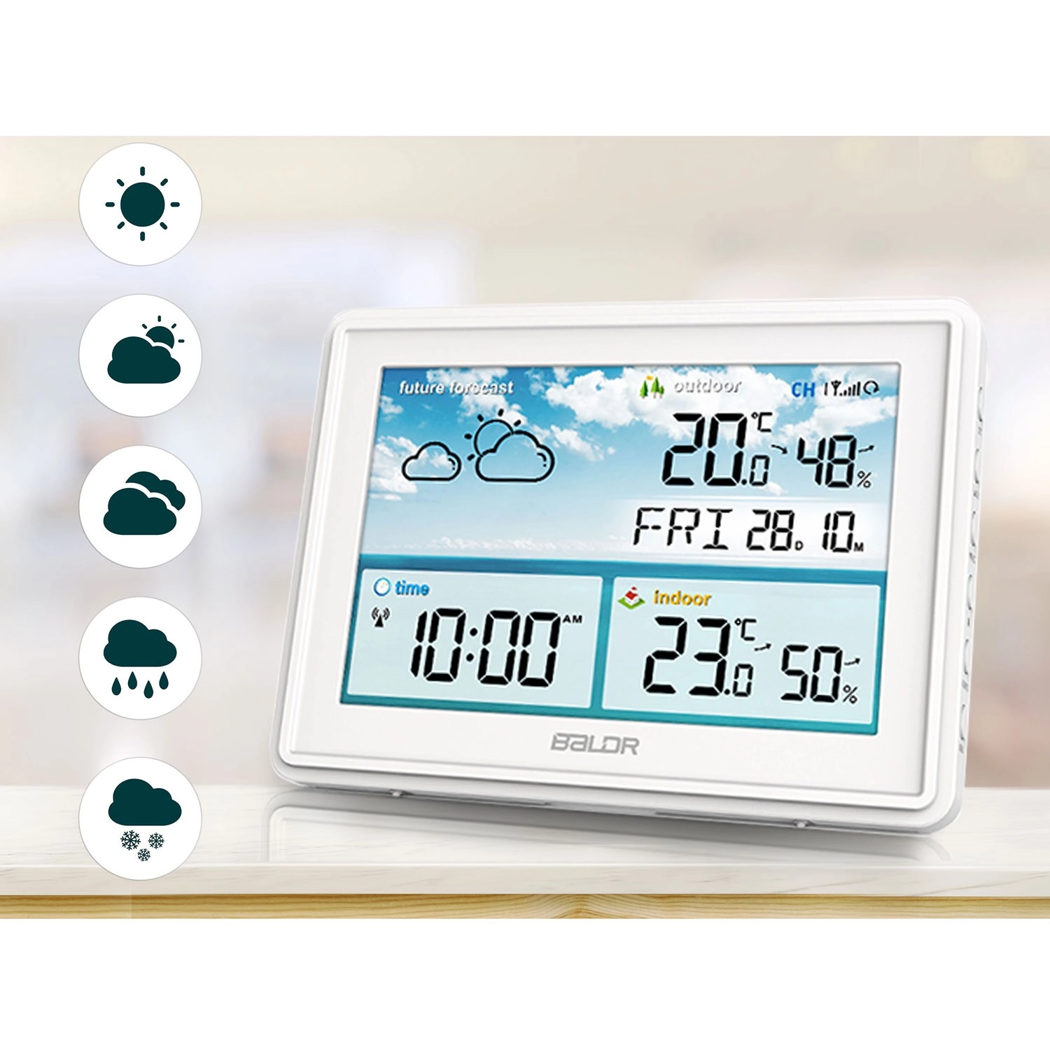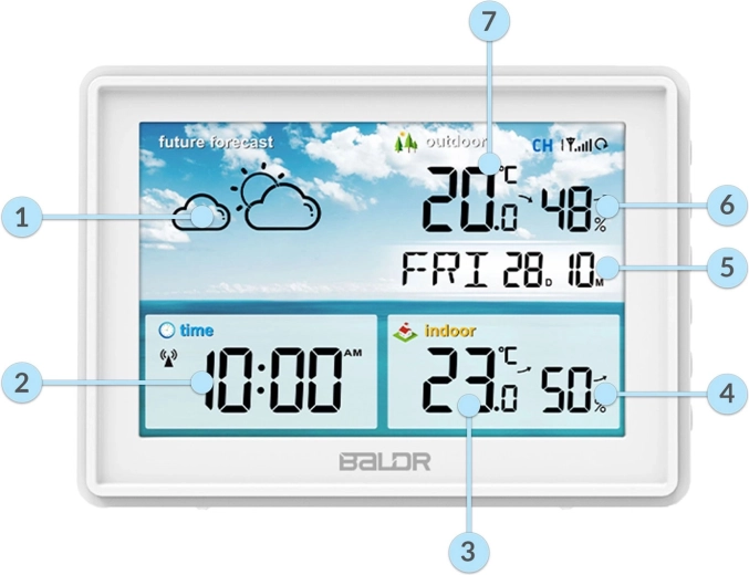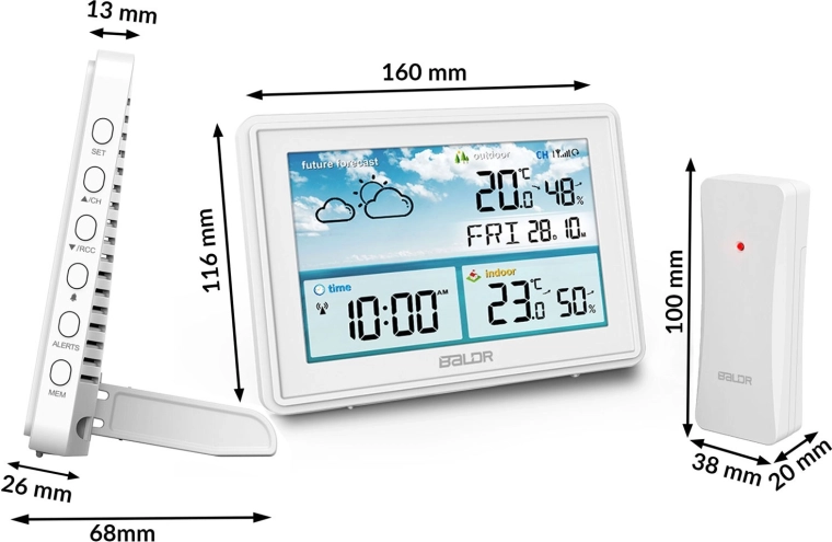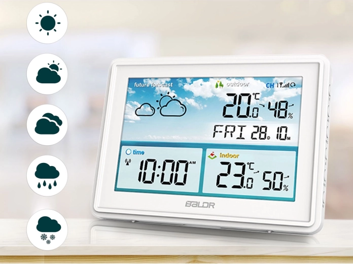 - Makkelijk afleesbare waarden en duidelijke weerspictogrammen