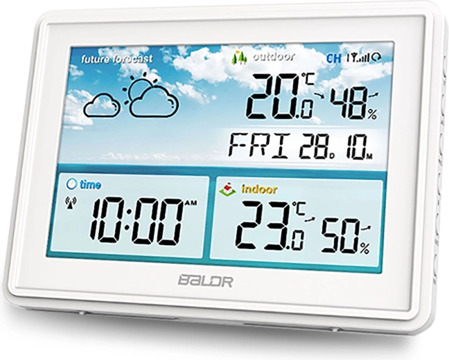 Dit elegante witte weerstation combineert nauwkeurige metingen met een overzichtelijke weergave op een groot lcd. Dankzij de draadloze buitensensor (bereik tot 60 m) heb je de actuele omstandigheden binnen en buiten altijd bij de hand. De 12-uurs weersvoorspelling is gebaseerd op continue analyse van temperatuur, druk en vochtigheid, zodat je je dag beter kunt plannen.
