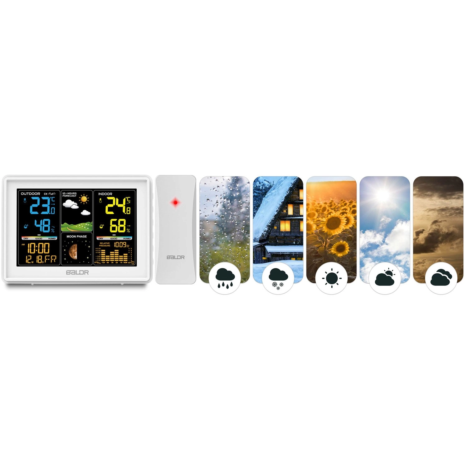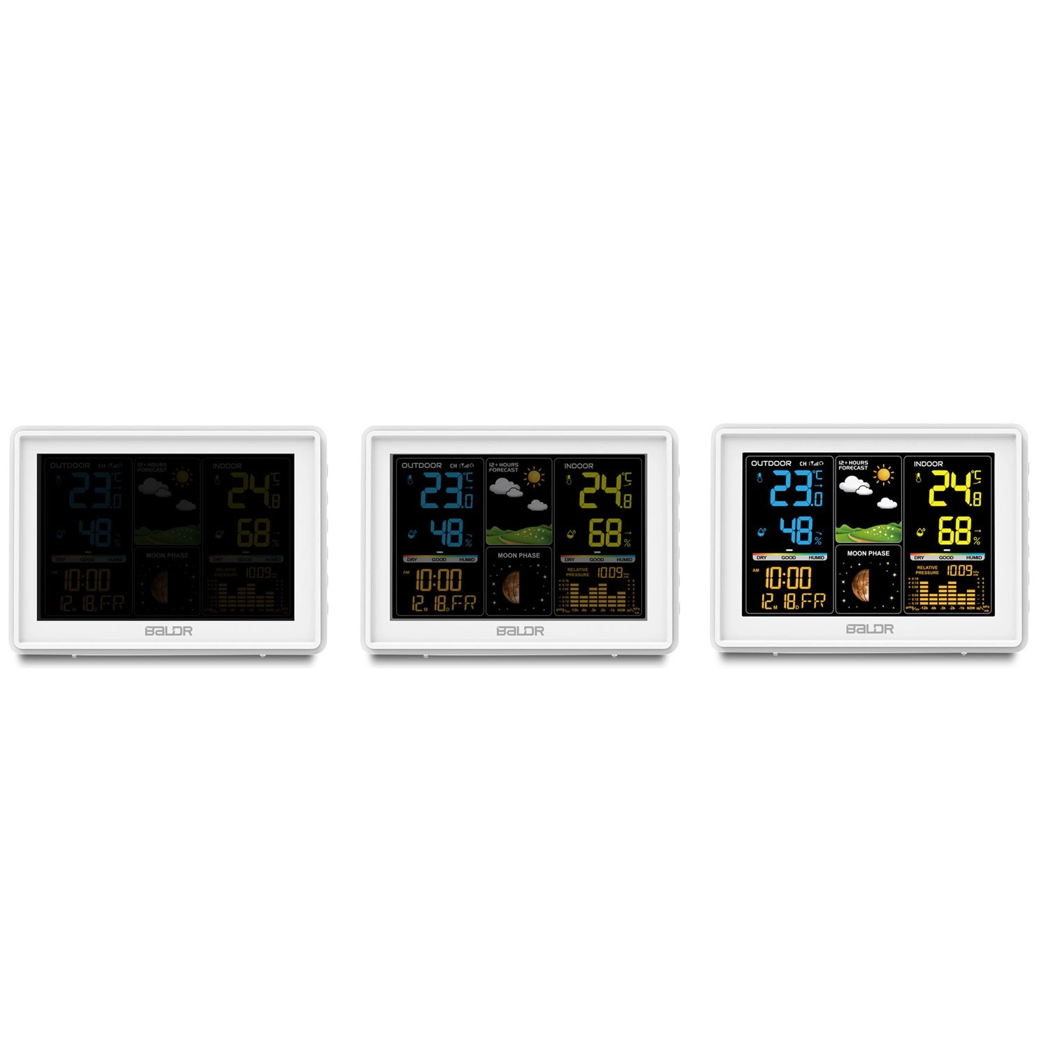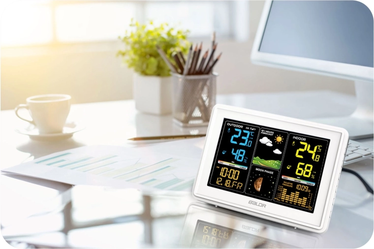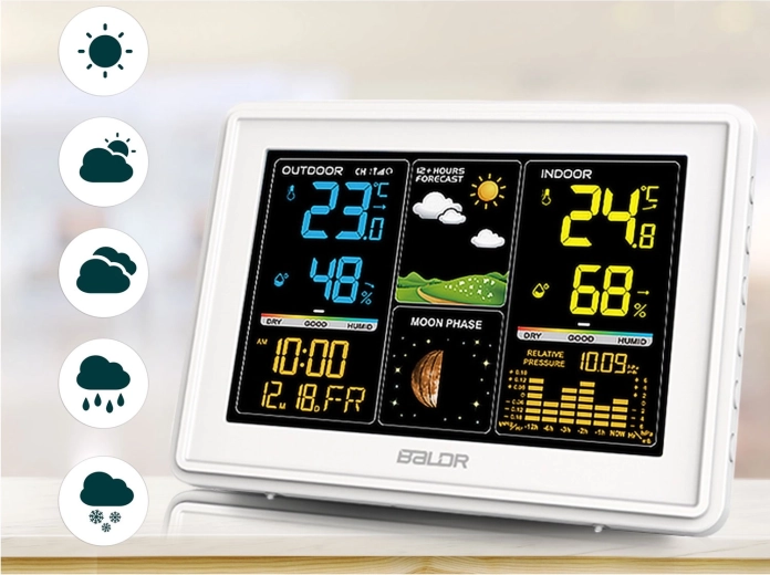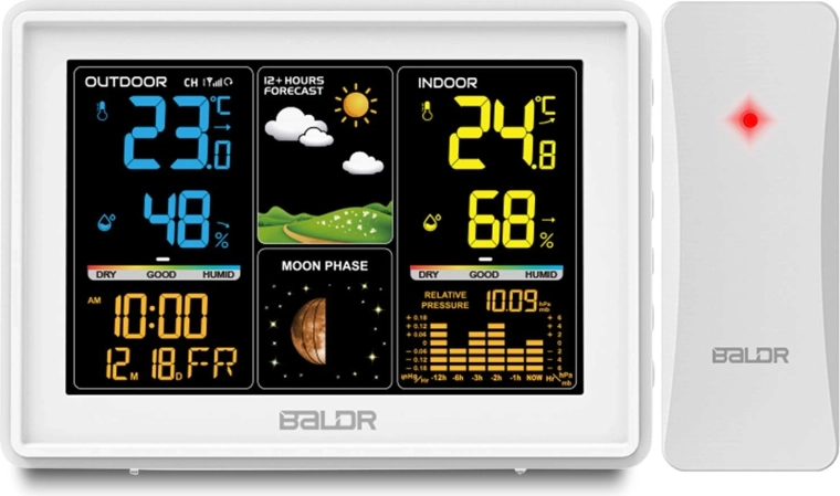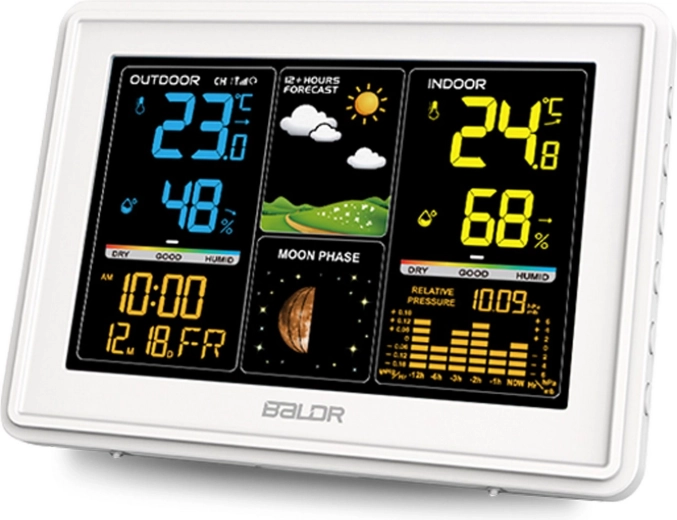 Modern weerstation voor thuis met een kleuren LCD, draadloze buitensensor en automatische tijdsynchronisatie via DCF77. Biedt een weersvoorspelling voor 12–24 uur, weergave van temperatuur en luchtvochtigheid binnen en buiten, een barometer met historie, maanfasen, wekker met sluimerfunctie en driedelige achtergrondverlichting. Ideaal om het binnenklimaat te bewaken dankzij de nauwkeurige hygrometer en het overzichtelijke display.