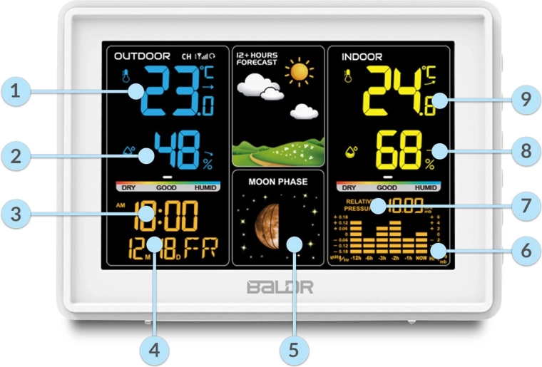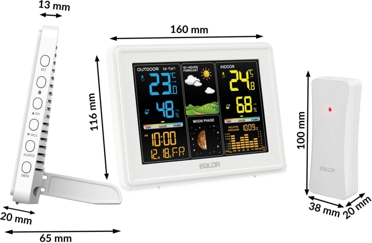 In de verpakking zit een draadloze buitensensor (bereik tot 60 m) die automatisch met het station wordt gekoppeld. Het apparaat bewaakt minima en maxima, toont een comfortindicator voor binnen en buiten, drukgeschiedenis van de laatste 12 uur, maanfasen en heeft een wekker met sluimerfunctie.