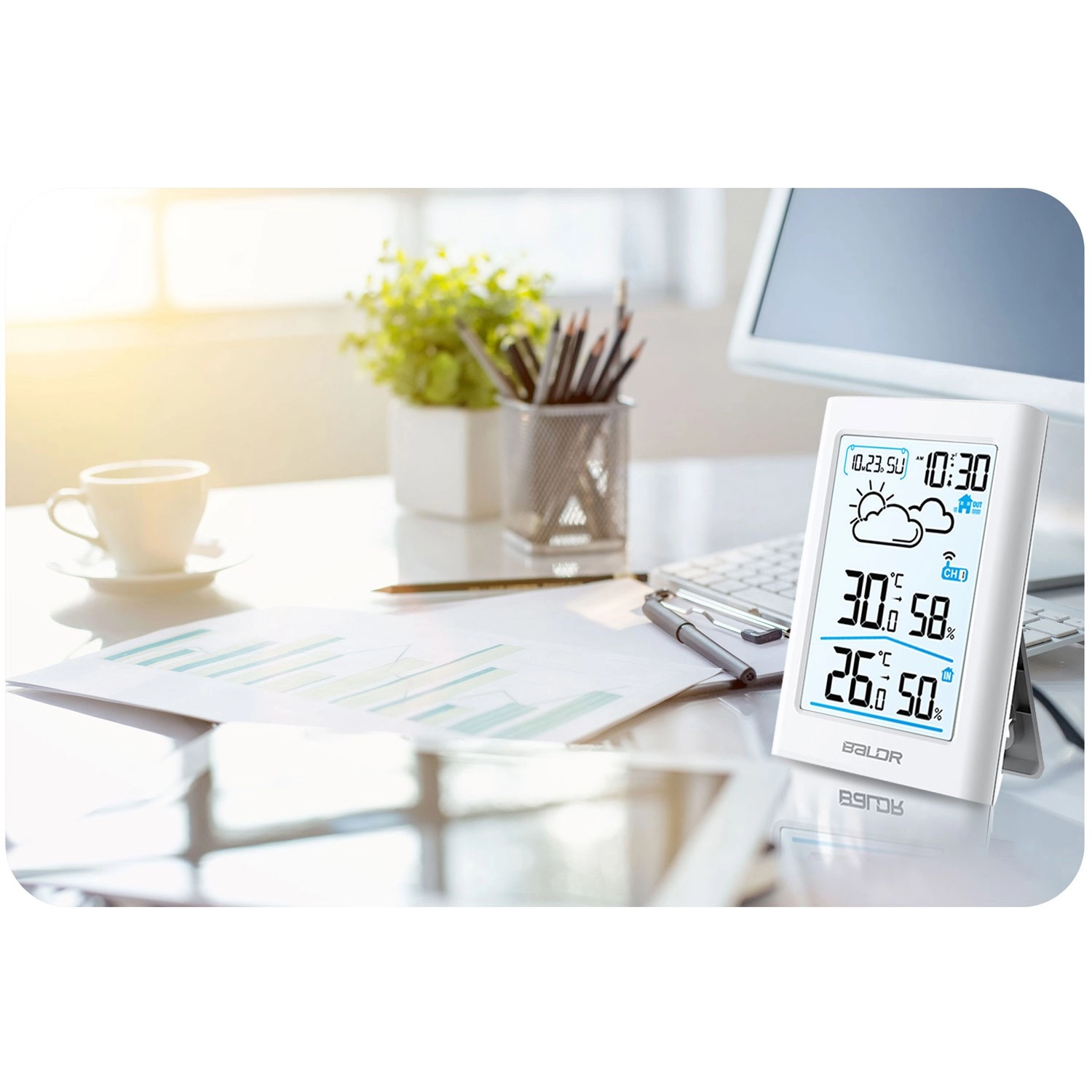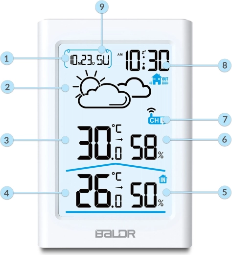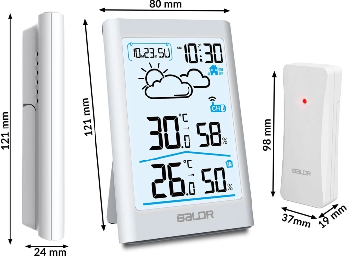 Het contrastrijke display toont tijd, datum, temperatuur, vochtigheid en weerpictogrammen. De achtergrondverlichting zorgt voor comfortabel gebruik overdag en ’s nachts.