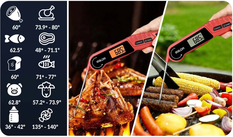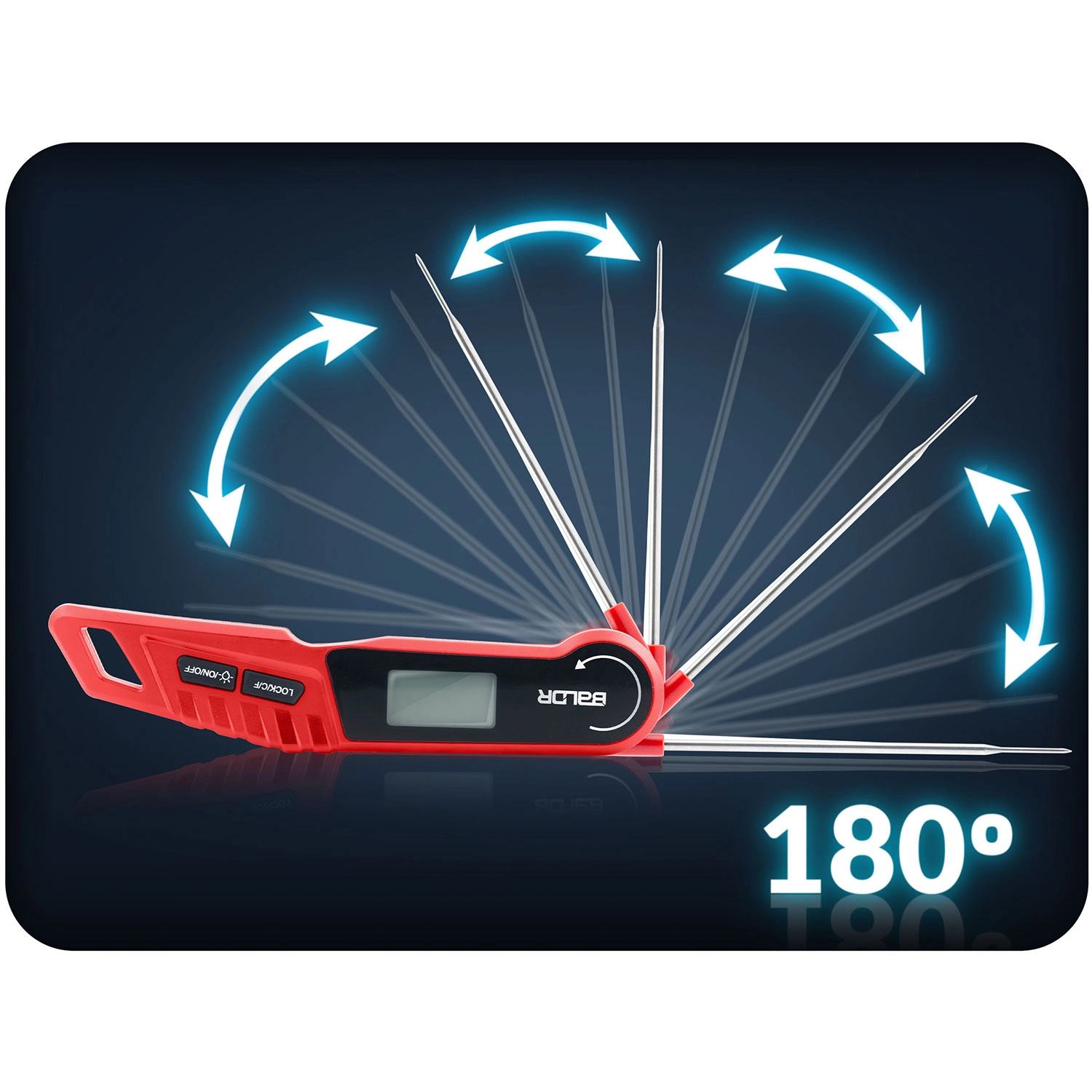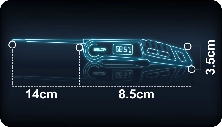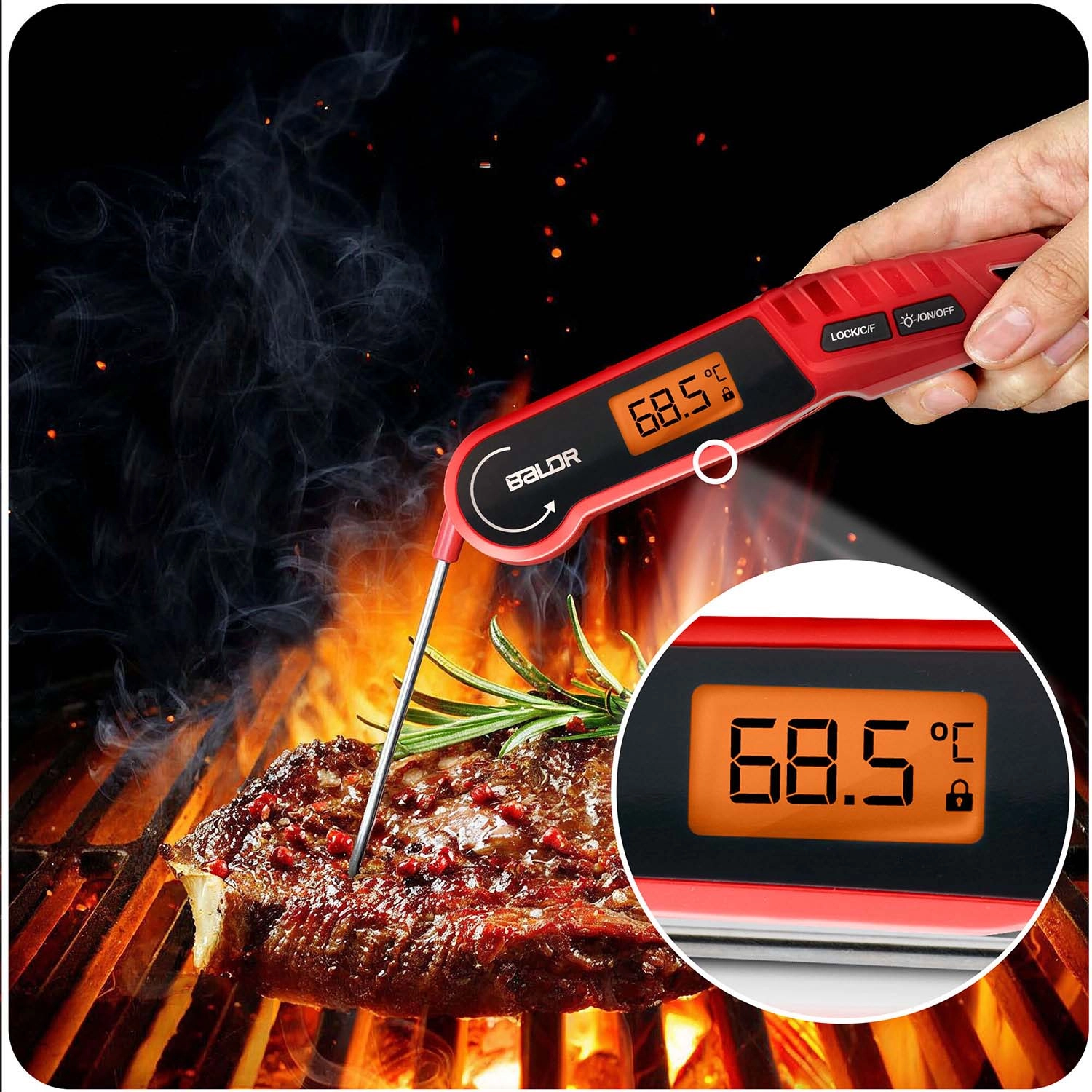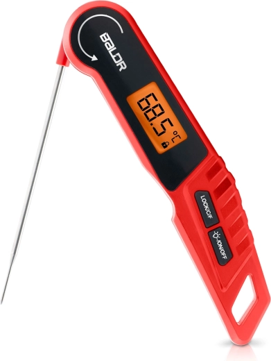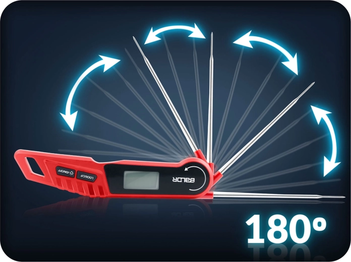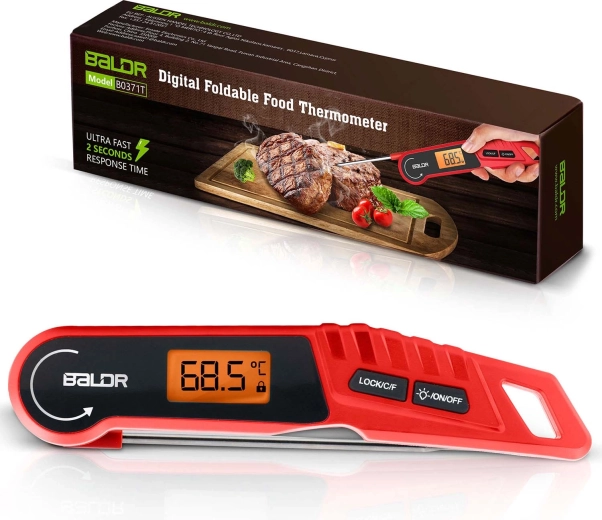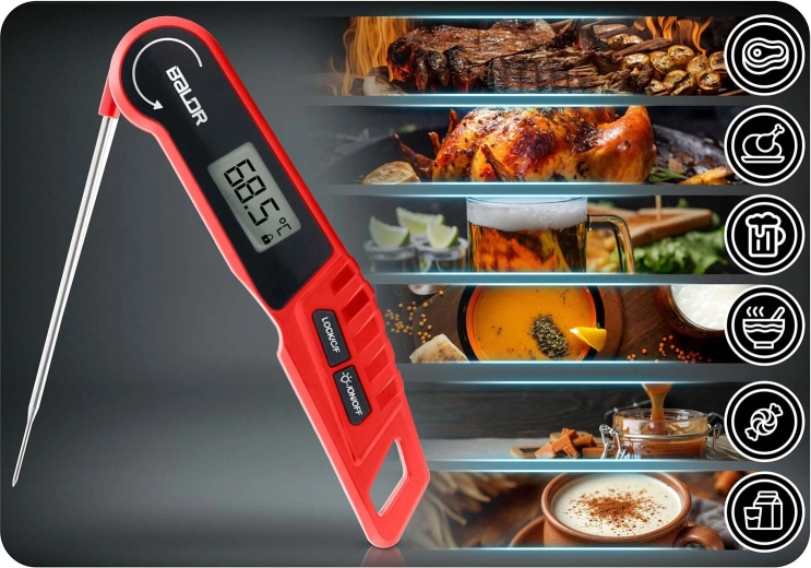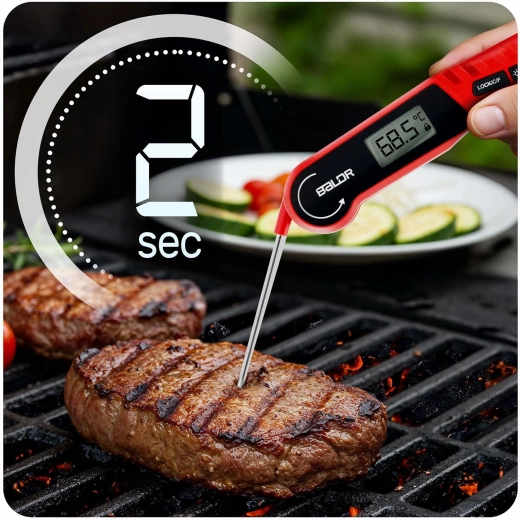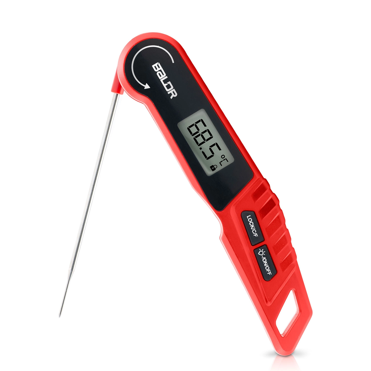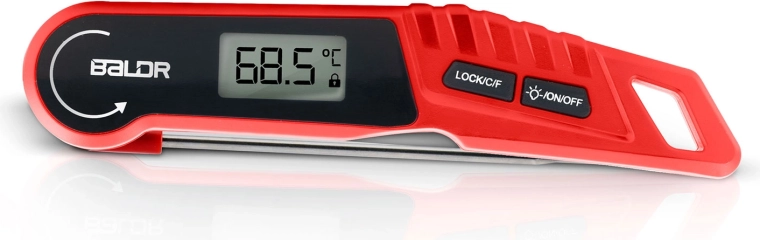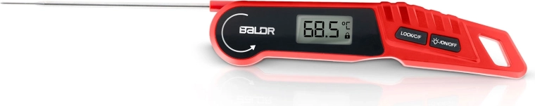 De snelle en nauwkeurige keukenthermometer BALDR BD-130 met uitklapbare stalen sonde meet de temperatuur in het bereik van -50 °C tot 300 °C binnen 2–3 seconden met een nauwkeurigheid van ±1 °C. Hij biedt een verlicht lcd-scherm, automatische schermrotatie, omschakeling °C/°F, LOCK-functie, waterbestendigheid IPX6 en een sterke magneet voor eenvoudige bevestiging op metalen oppervlakken – ideaal voor keuken en grill.