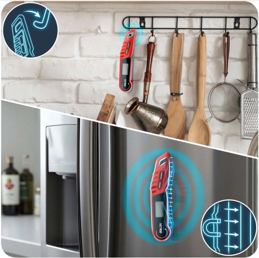 Praktische functies zoals een verlicht lcd-scherm, automatische rotatie van het beeld, omschakelbare eenheden °C/°F en LOCK voor het tijdelijk vasthouden van de meting maken het gebruik eenvoudig onder alle omstandigheden. Waterbestendigheid IPX6 maakt afspoelen onder stromend water mogelijk en een geïntegreerde magneet en ophangoog zorgen ervoor dat de thermometer altijd binnen handbereik is – op de koelkast, oven of grill.