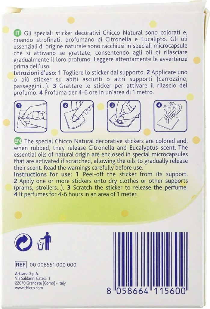 Bescherm jezelf en je kinderen tegen hinderlijke insecten met de natuurlijke geparfumeerde stickers van Chicco. Dankzij de essentiële oliën (citroengras en eucalyptus citriodora) en de microcapsules komt de geur geleidelijk vrij na activering door wrijving. De stickers zijn ideaal voor buitenactiviteiten, uitstapjes en dagelijks gebruik.