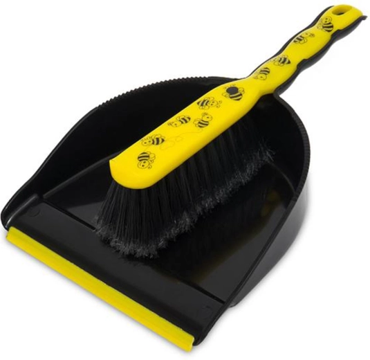 Praktische set voor dagelijks schoonmaken – handveger met blik met het motief van bijtjes. Licht, compact en gemakkelijk te hanteren hulpmiddel dat snel kruimels, stof en vuil van vloeren en werkbladen verwijdert.