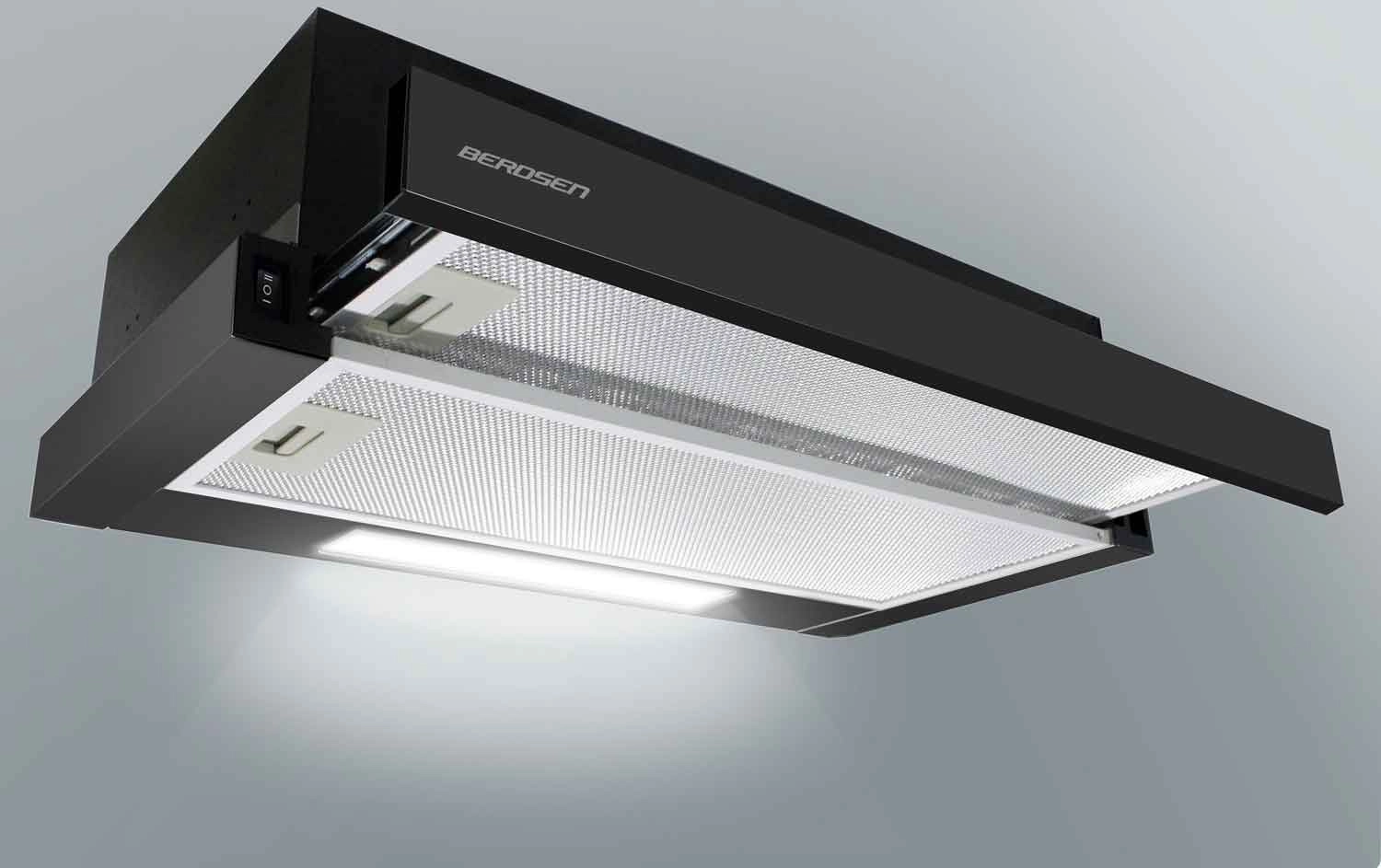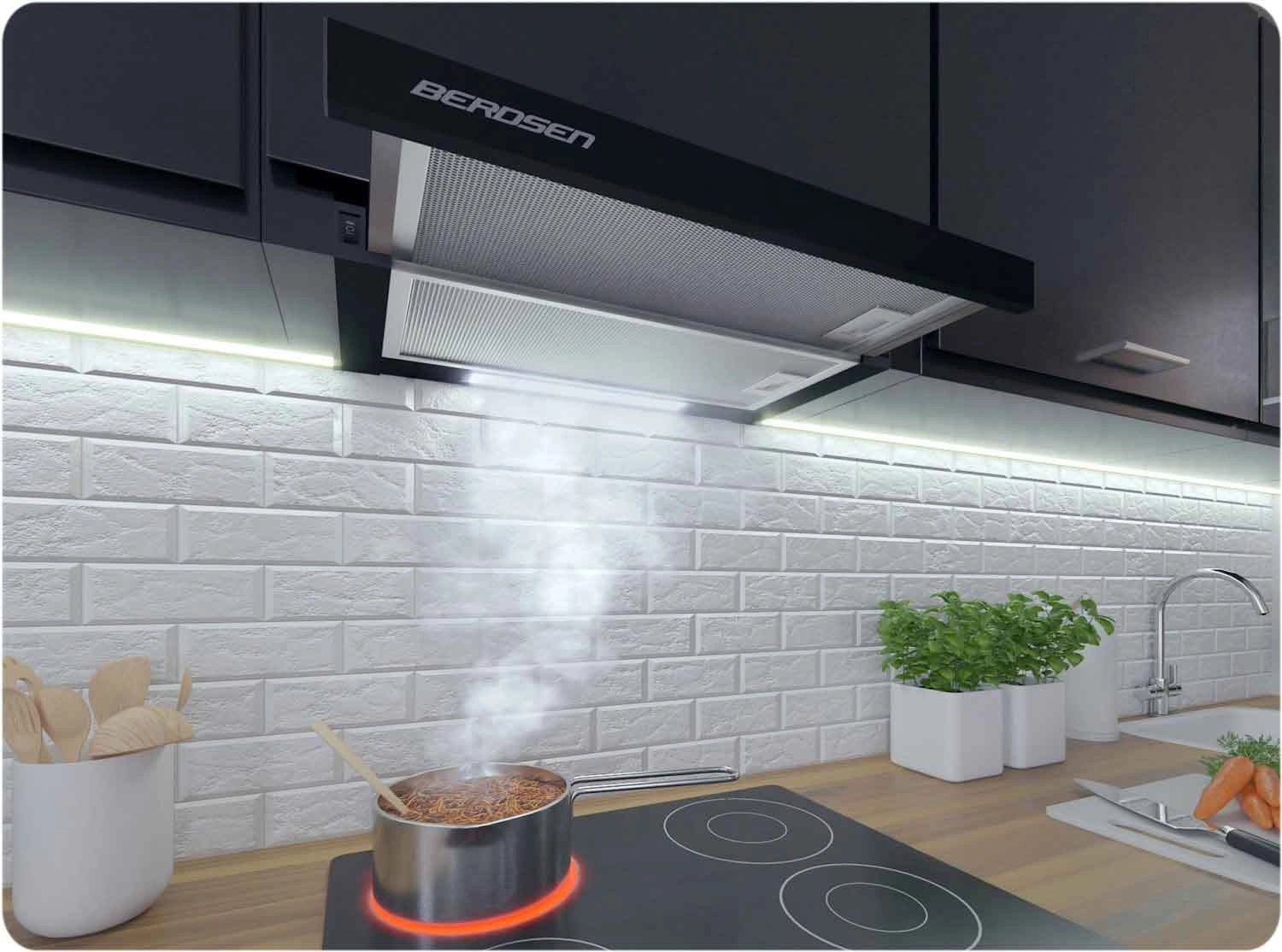 De BERDSEN BT-230 in matzwart past bij moderne en minimalistische interieurs. LED-licht zorgt voor beter zicht op de kookplaat, mechanische bediening is betrouwbaar en intuïtief, en het duo versterkte 3-laagse aluminiumfilters vangt vet effectief op en kan eenvoudig worden verwijderd en gereinigd.