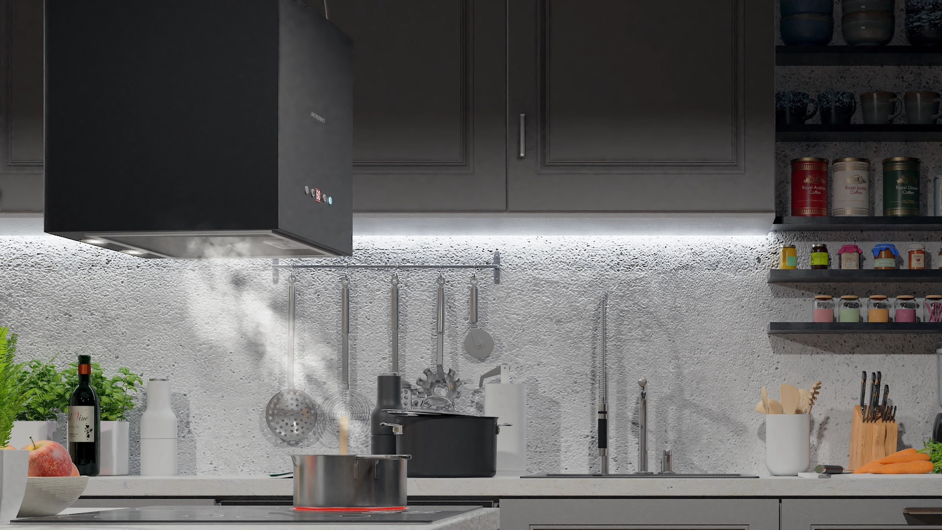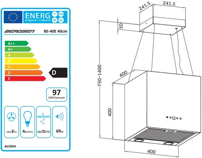 - Modern uiterlijk voor eilandkeukens – compacte 40 cm kubus, aan het plafond opgehangen.