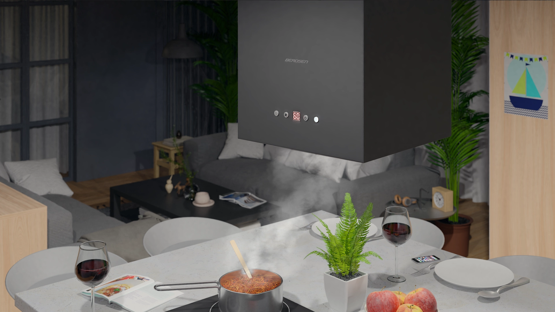 De design-eilandafzuigkap BERDSEN BT-3140 combineert krachtige prestaties met een strakke esthetiek. De behuizing van roestvrij staal in matte zwarte afwerking past perfect in moderne interieurs, terwijl de zuinige LED-verlichting (2 × 2 W) zorgt voor een natuurlijke lichtkleur en een lange levensduur. Het maximale vermogen van 360 m³/h reduceert betrouwbaar stoom en geuren boven het kookcentrum.
