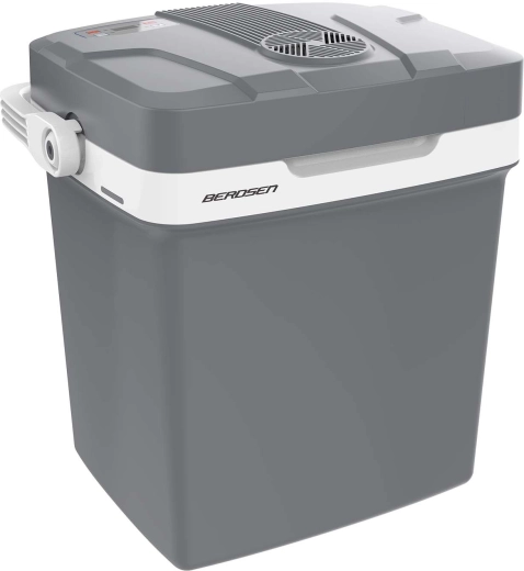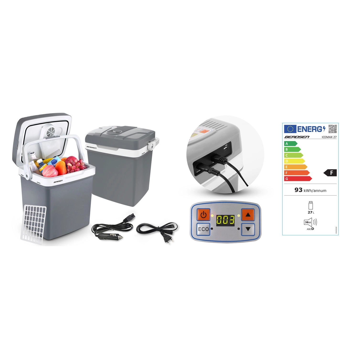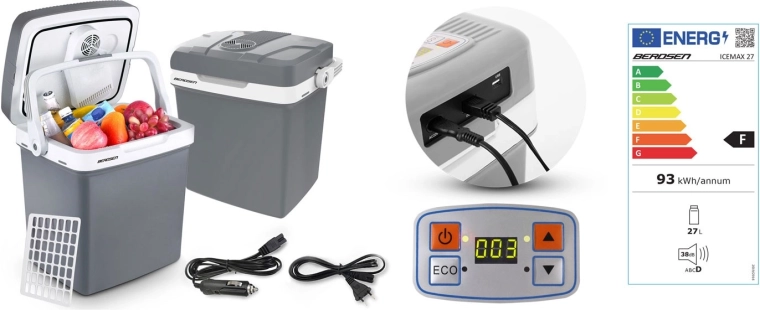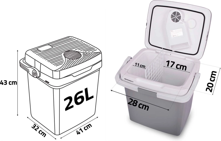 Deze draagbare thermo-elektrische auto-koelbox is een betrouwbare oplossing voor vakantie, kamperen en lange autoritten. Hij biedt een royale inhoud van 26 l, een elektronisch paneel voor nauwkeurige temperatuurinstelling en twee bedrijfsmodi – ECO voor energiebesparing en Normal voor het snel bereiken van de gewenste temperatuur. De thermo-elektrische technologie zonder compressor zorgt voor laag verbruik, lange levensduur en laag gewicht.