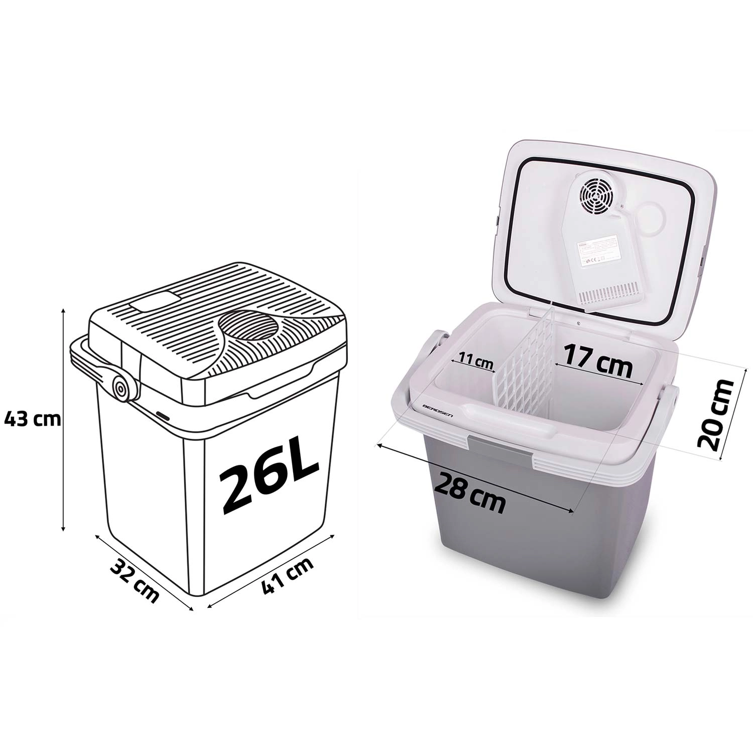 Lichte reis-koelbox met koel- en verwarmingsfunctie en een inhoud van 26 liter houdt etenswaren en dranken onderweg op de ideale temperatuur. Biedt een elektronisch display met instelbare doeltemperatuur, ECO- en Normal-modi, voeding 12 V voor in de auto en 230 V voor het stopcontact en stille werking van 39 dB. Dankzij de geïntegreerde ventilator is de koeling gelijkmatig en de praktische inklapbare handgreep vergemakkelijkt het dragen.