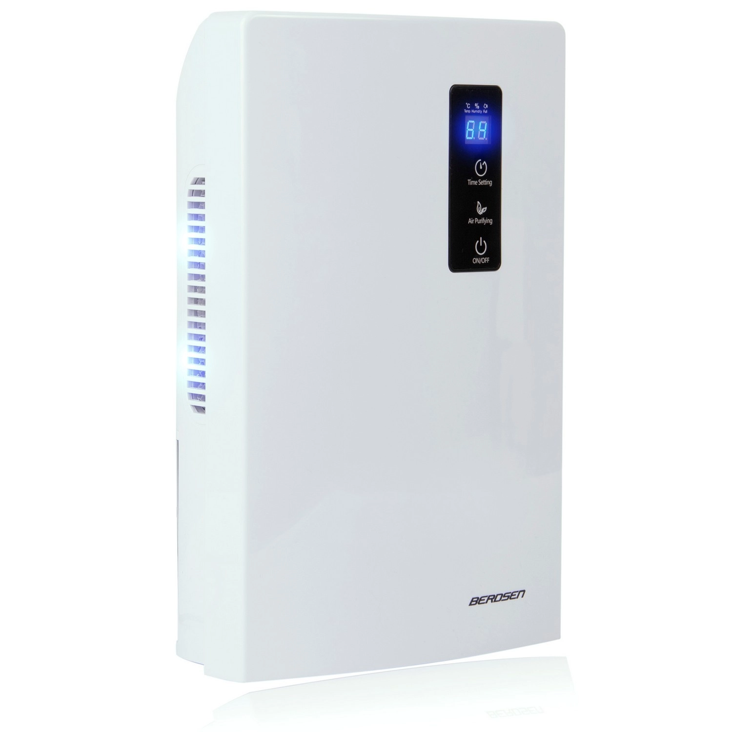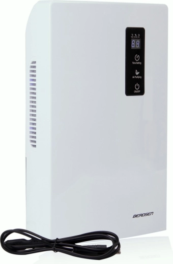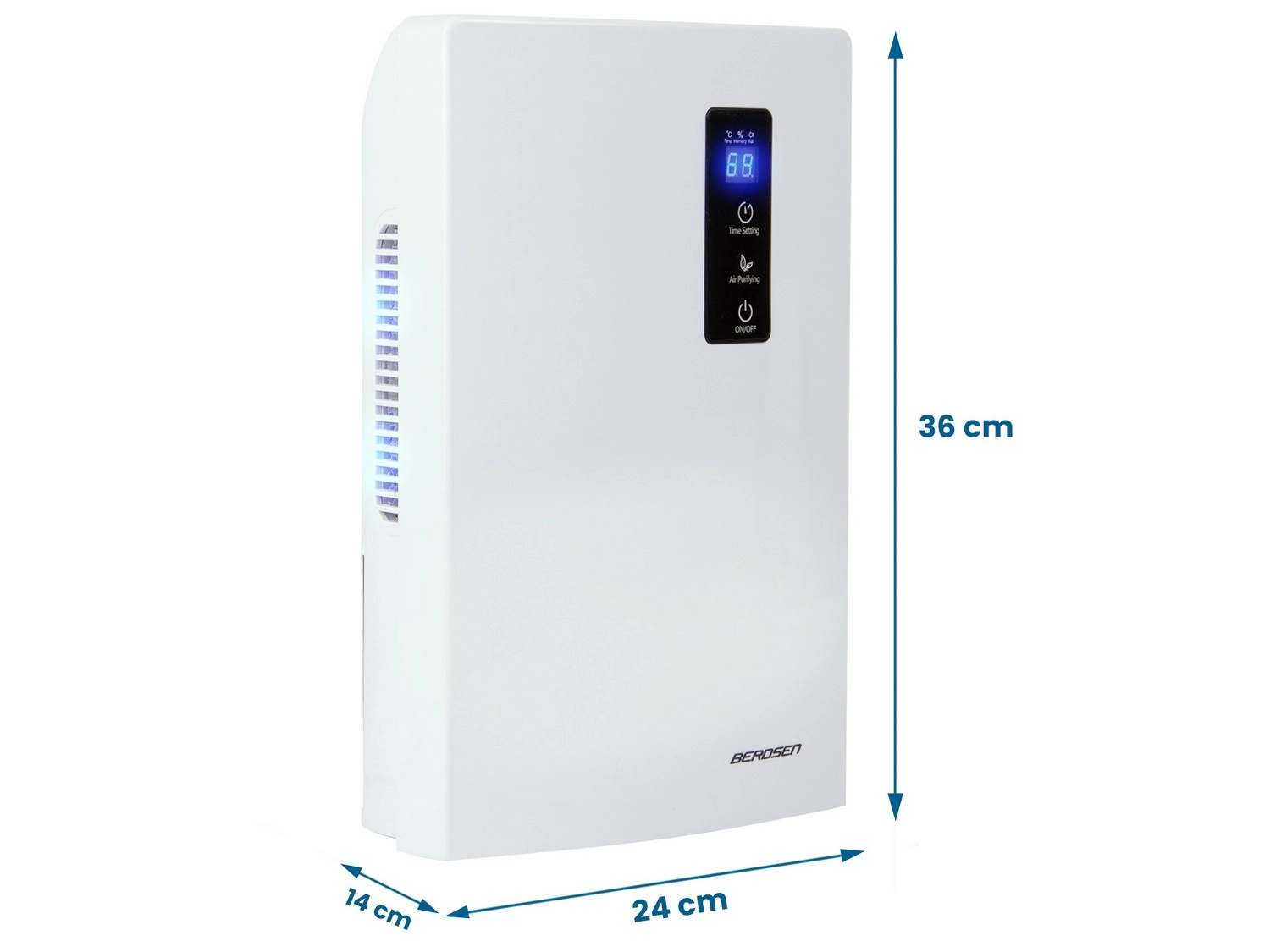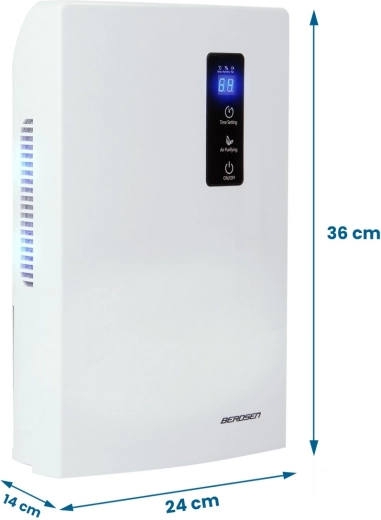 Krachtige Berdsen BR-20 luchtontvochtiger met Peltier‑technologie en geïntegreerde functie voor UV-luchtreiniging, die effectief vocht, schimmel en geurtjes bestrijdt. Biedt stille werking (max. 34 dB), touch LED-display, timer 1–24 u en automatische uitschakeling bij een volle 2 l tank. Ideaal voor ruimtes tot 30 m³.
