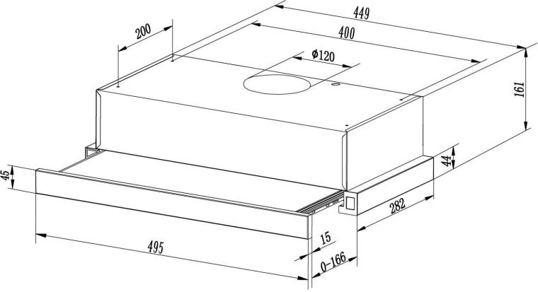 Werking als afvoer naar de schoorsteen (Ø120 mm) of recirculatie met koolstoffilter BT-M. Geïntegreerde LED van 2 W verlicht het kookvlak helder.