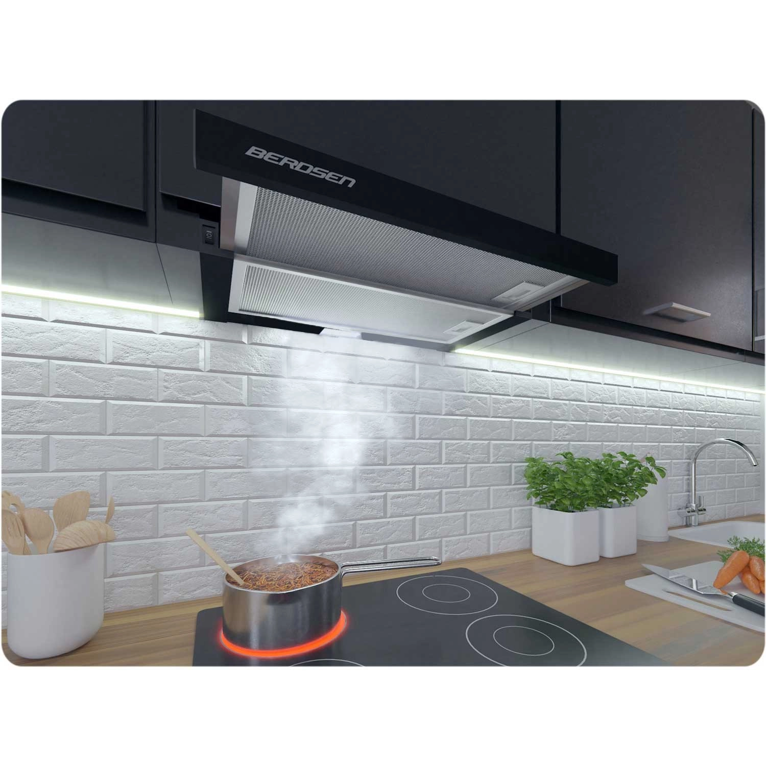 De elegante inbouw telescopische afzuigkap van BERDSEN verwijdert stoom, geuren en vet efficiënt direct bij de bron. Dankzij de uittrekbare lijst krijgt u een groter aanzuigoppervlak en hogere efficiëntie, terwijl de compacte behuizing verborgen blijft in het keukenmeubel. U zult ook de zuinige 2 W LED-verlichting waarderen, die het kookoppervlak perfect verlicht.