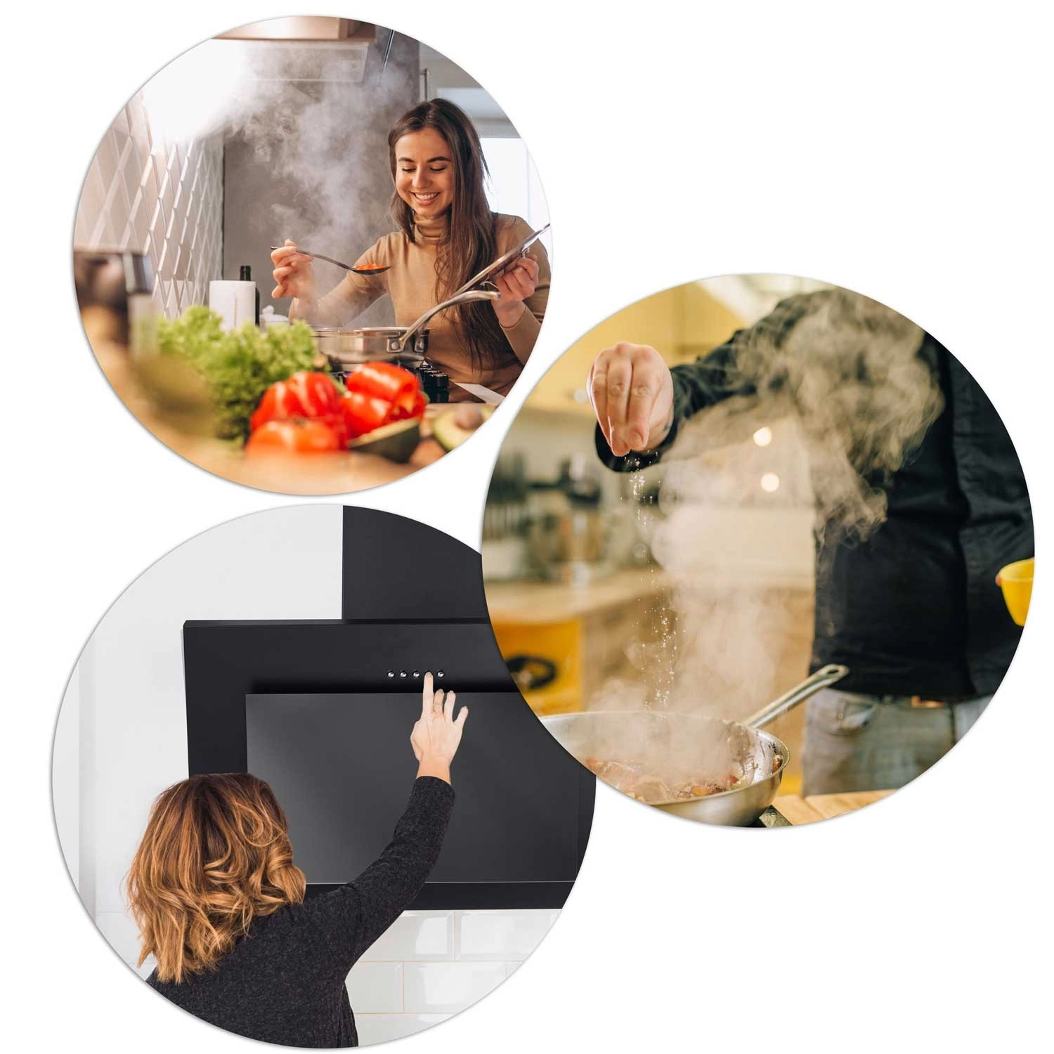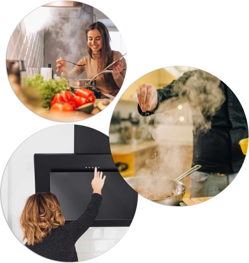 Het lage profiel, zwart staal en het glazen front lopen naadloos over in het kastwerk. De afzuigkap werkt stil en efficiënt zonder de strakke lijnen van de keuken te verstoren.