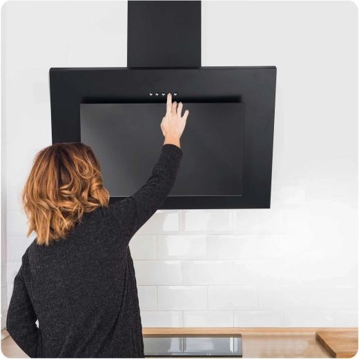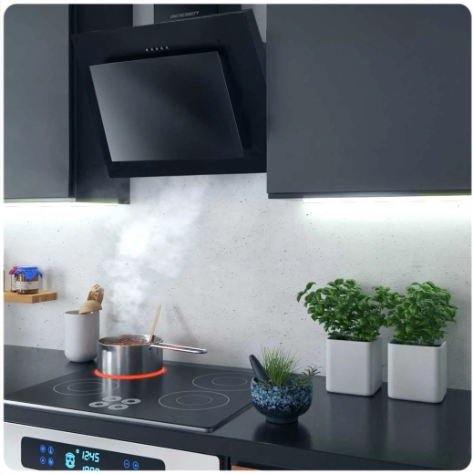 Stijlvolle en functionele afzuigkap voor moderne keukens. De voorste zwarte glasplaat van gehard glas geeft de kookzone een premium uitstraling, terwijl stille en efficiënte afzuiging stoom, vet en geuren verwijdert. Dankzij de keuze voor afvoer naar de schoorsteen of recirculatie met een koolstoffilter past hij zich eenvoudig aan de indeling van uw keuken aan.