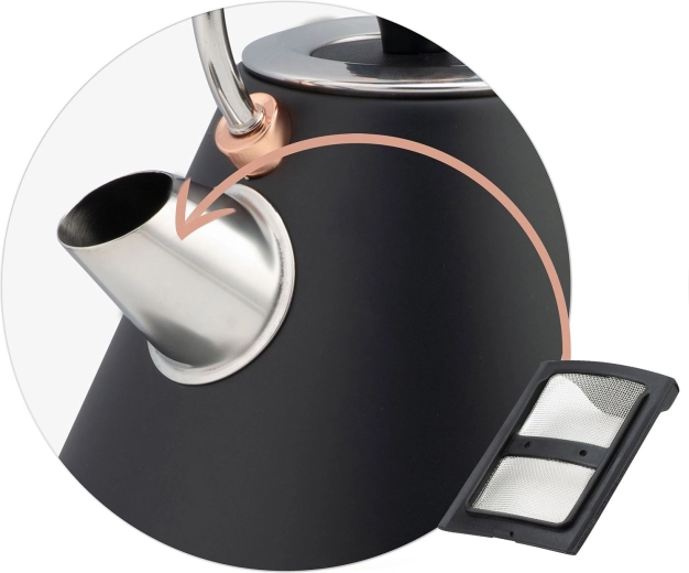 Het uitneembare metalen filter in de schenktuit vangt kalkaanslag en onzuiverheden op. Gemakkelijk te reinigen of te vervangen.