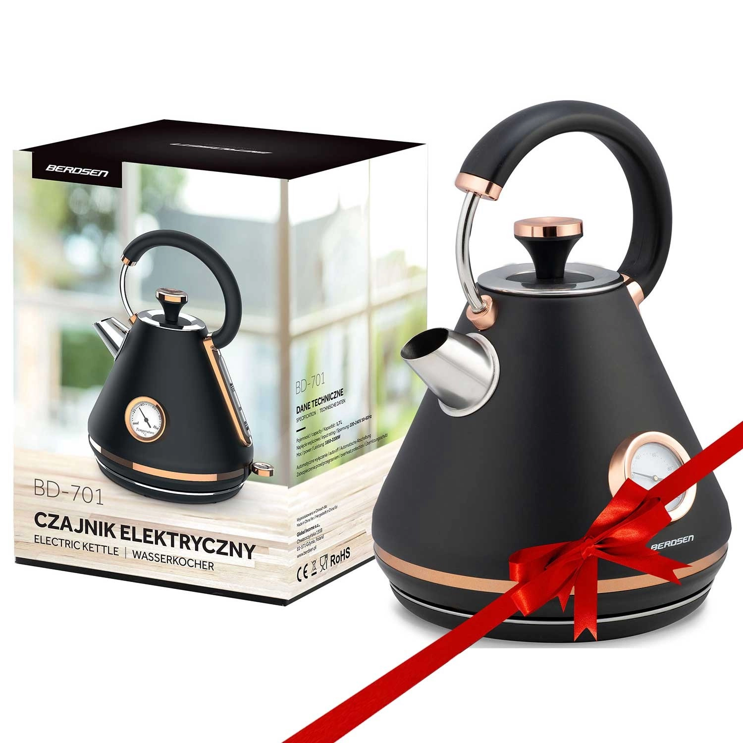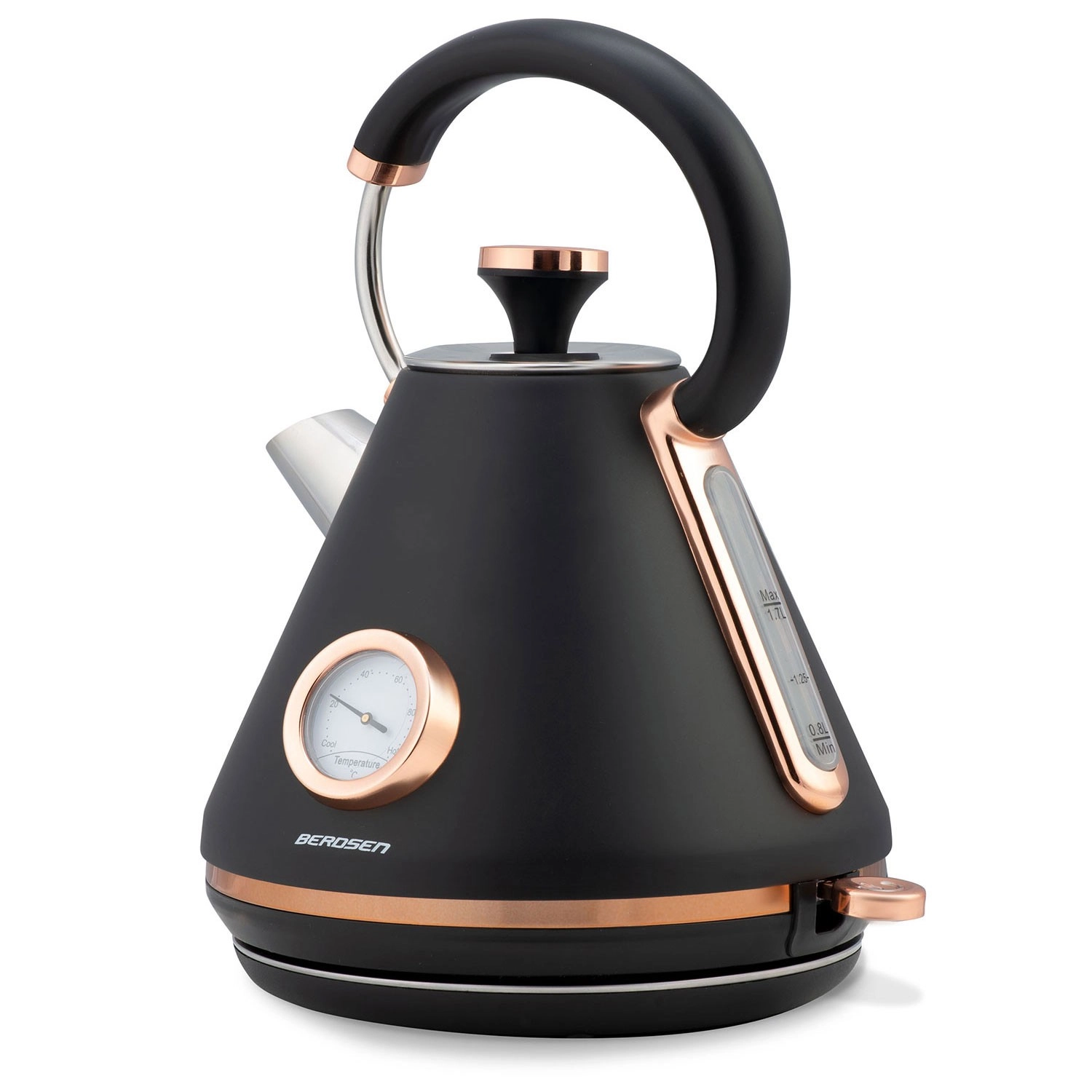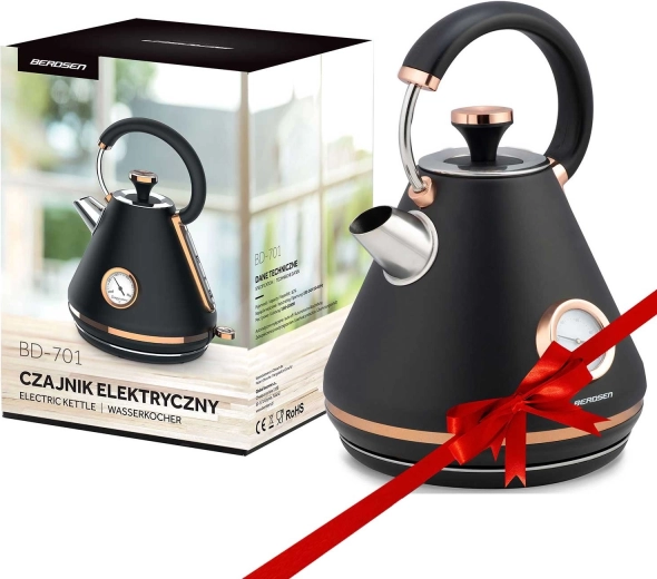 Stijlvolle retro waterkoker Berdsen 1,7 l met een geïntegreerde analoge thermometer voor nauwkeurige bereiding van thee en koffie. Biedt een metalen behuizing met matte afwerking, een 360° draaivoet, een verlichte aan/uit-schakelaar, een koelblijvend handvat en een uitneembaar anti-kalkfilter voor schoner water. De praktische afneembare deksel, waterpeil-indicator en antislipvoetjes zorgen voor comfortabel en veilig gebruik.