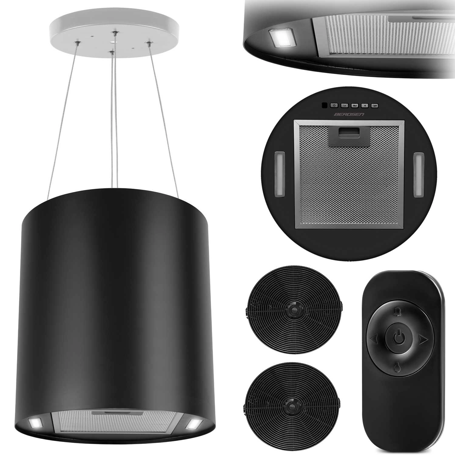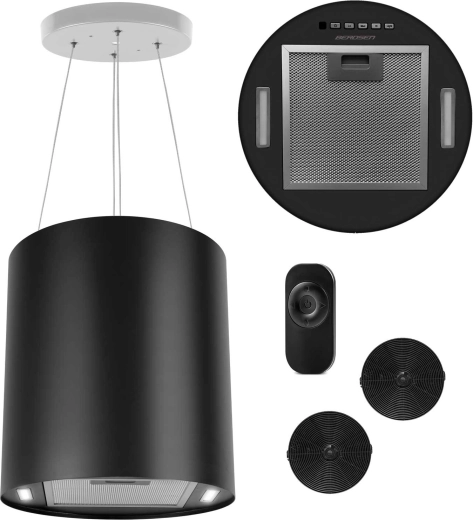 Elegante eilandafzuigkap met een diameter van 35 cm in matzwart met krachtige afzuiging tot 550 m³/u, stille werking van 62 dB en energiezuinige LED-verlichting. Dankzij 3 snelheden, bediening via knoppen en afstandsbediening en een 3-laags aluminium vetfilter met koolstoffilters inbegrepen is hij ideaal voor moderne keukens in recirculatiestand.