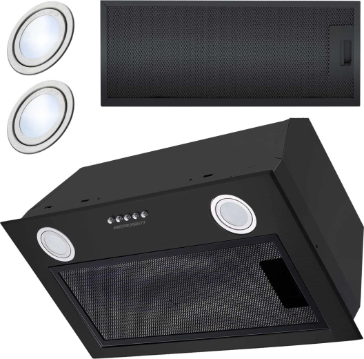 Elegante inbouwafzuigkap met een breedte van 60 cm in zwarte uitvoering voor discrete integratie in het keukenmeubel. Biedt krachtige afzuiging tot 380 m³/uur, energiezuinige LED-verlichting (2 × 2 W) en handmatige bediening met 3 snelheden. Dankzij het 5-laags aluminium vetfilter wordt vet effectief opgevangen, vervuiling verminderd en blijft de keuken schoner.