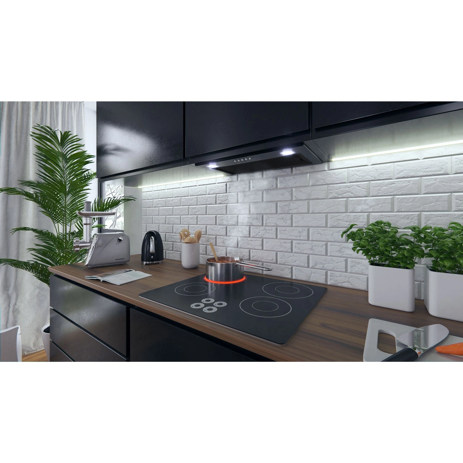 Een discrete en praktische afzuigkap die een vanzelfsprekend onderdeel van uw keuken wordt. Het minimalistische ontwerp in zwart past perfect bij moderne keukens, terwijl de krachtige motor zorgt voor afvoer van stoom, geuren en vocht. De geïntegreerde LED-verlichting verlicht het kookoppervlak gelijkmatig en verhoogt het kookcomfort.