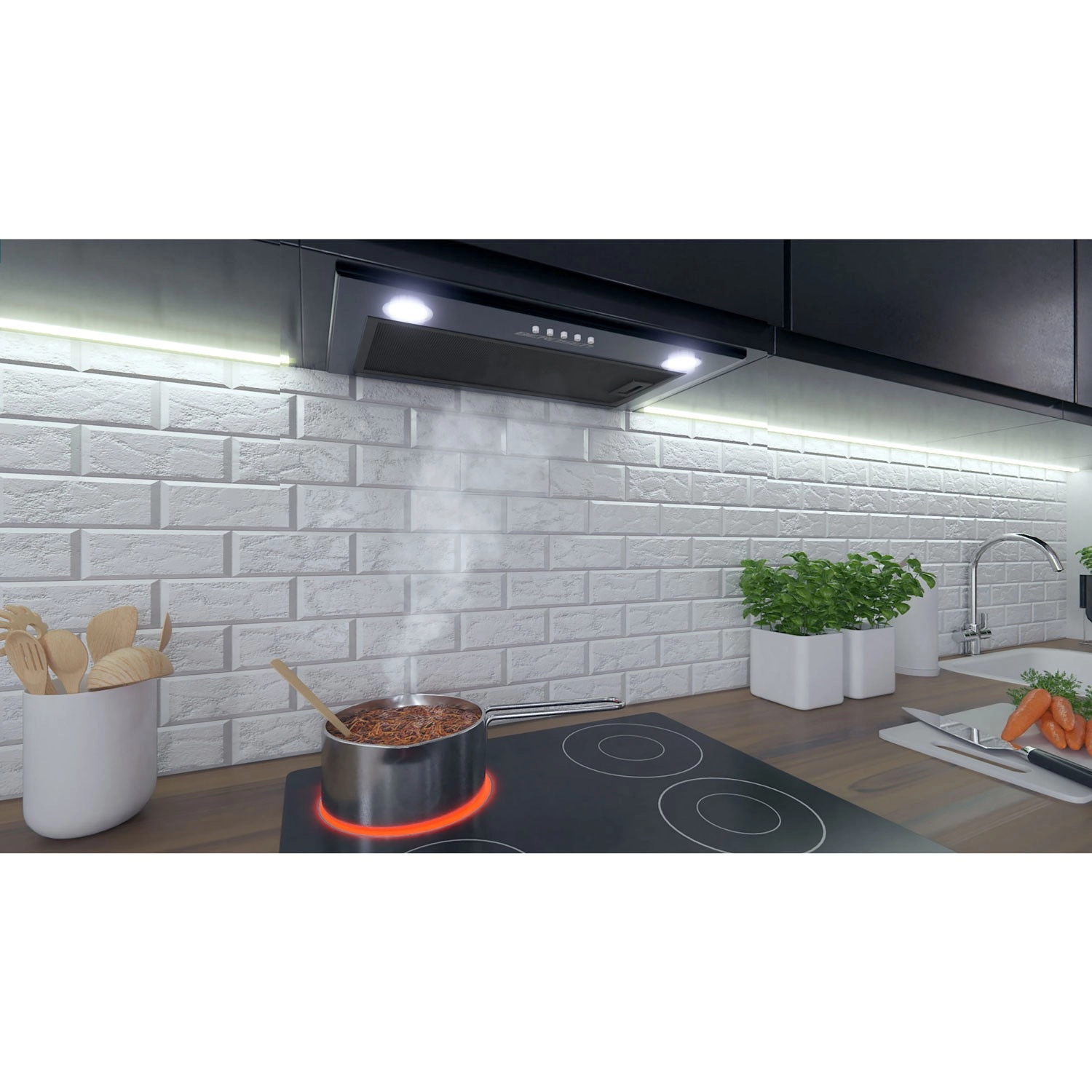De inbouw onderbouw afzuigkap van Berdsen in het zwart is een onopvallende maar krachtige aanvulling op je keuken. Met een maximale afzuigcapaciteit van tot 380 m³/u pakt hij stoom en vet effectief aan, zodat aanslag zich niet op kasten of tegels afzet. Twee LED-lichtbronnen (2 × 2 W) zorgen voor aangenaam en zuinig licht boven het werkblad.