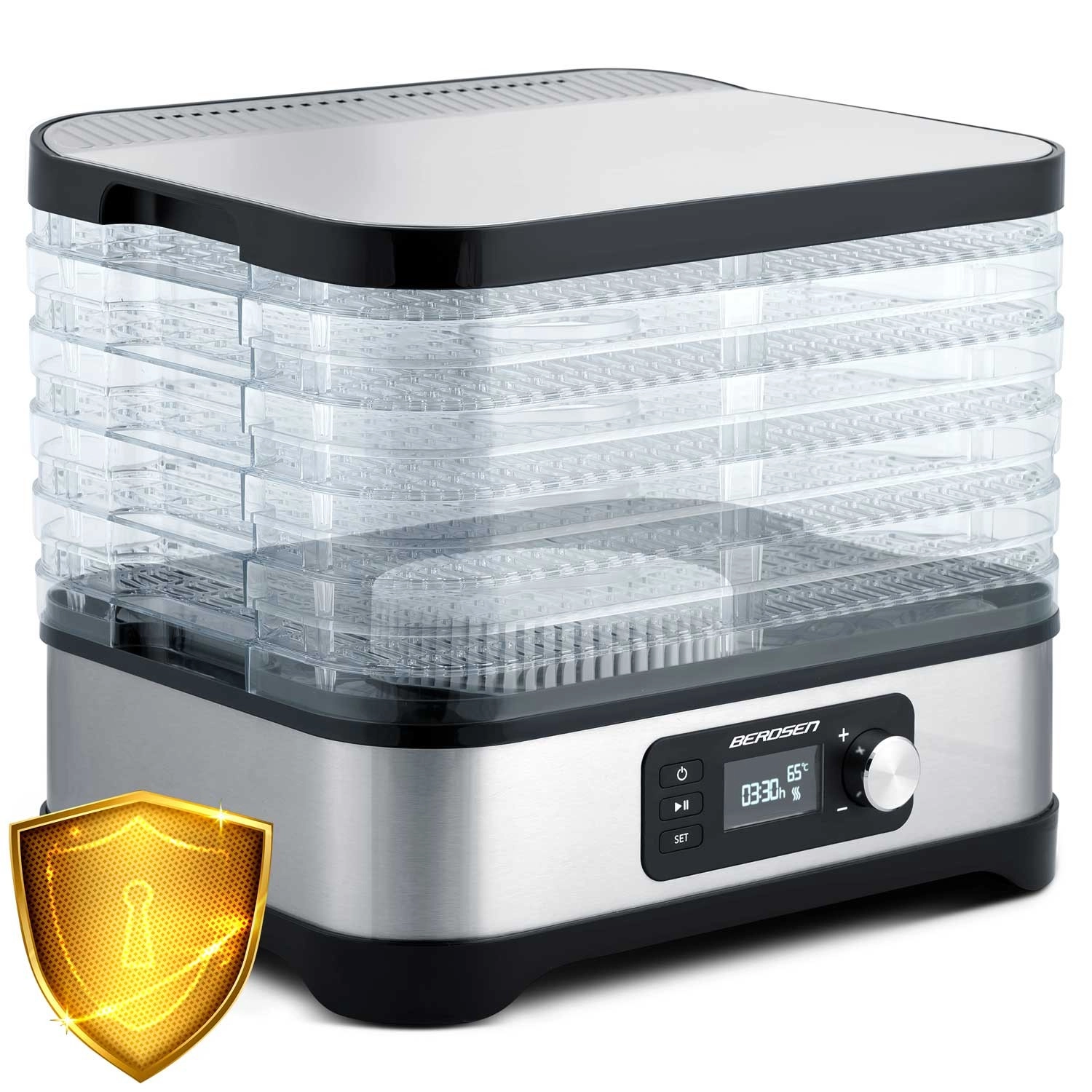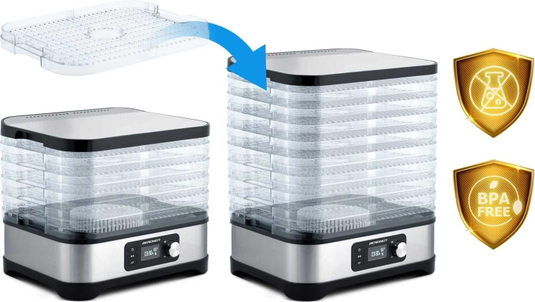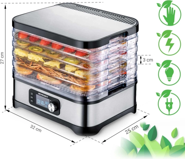 Geniet het hele jaar door van gezonde snacks – gedroogde appels, pruimen, aardbeien, kruiden en paddenstoelen bereid je precies naar smaak. De Berdsen droger combineert een krachtig verwarmingselement van 400 W met nauwkeurige elektronische temperatuurcontrole, waardoor hij zacht en gelijkmatig droogt. Met het intuïtieve paneel stel je een timer van 1–24 uur in voor zorgeloos gebruik.