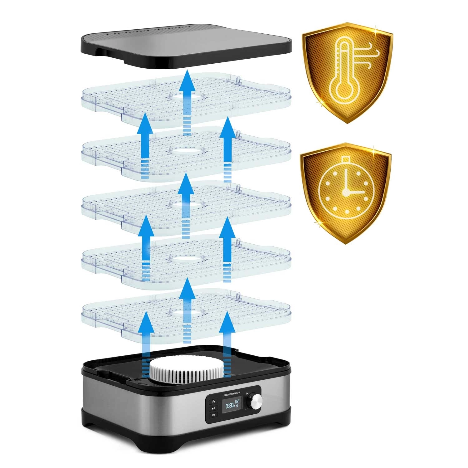 Het elektronische paneel met display en draaiknop laat je de ideale temperatuur instellen voor fruit, groenten, kruiden en vlees. Een stabiele luchtstroom zorgt voor gelijkmatige resultaten zonder overdrogen.