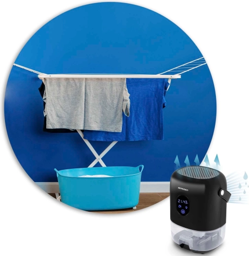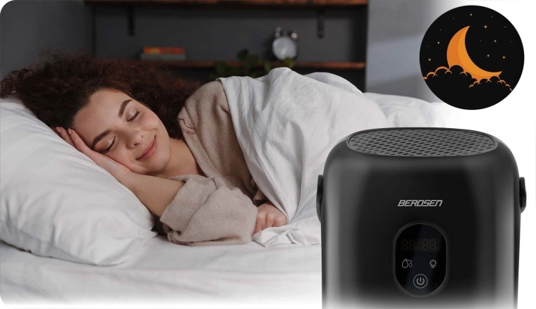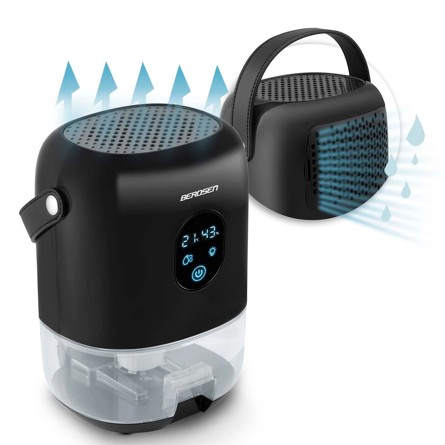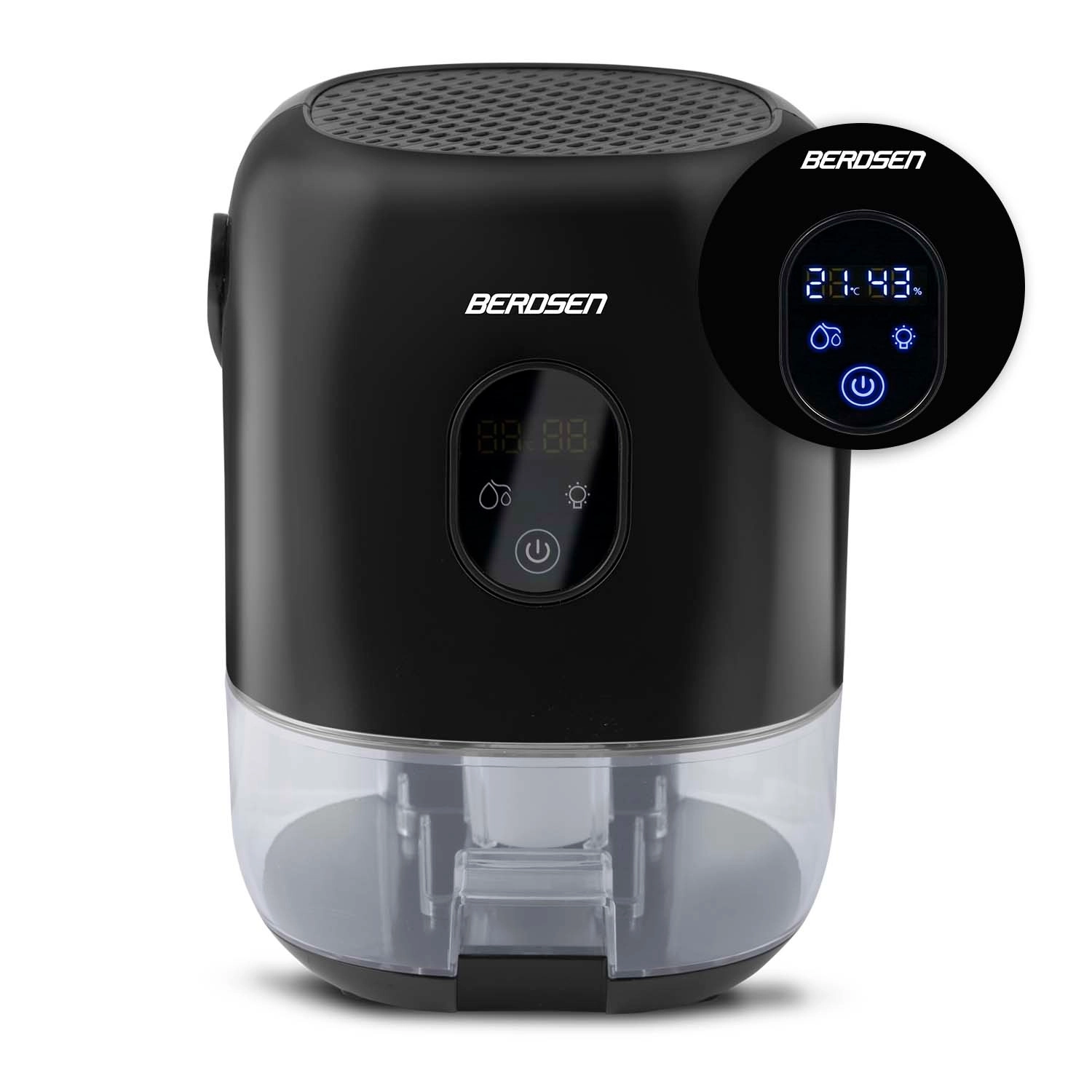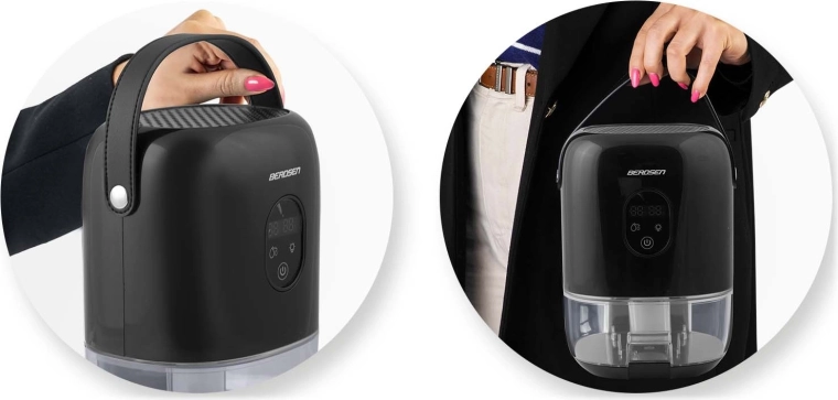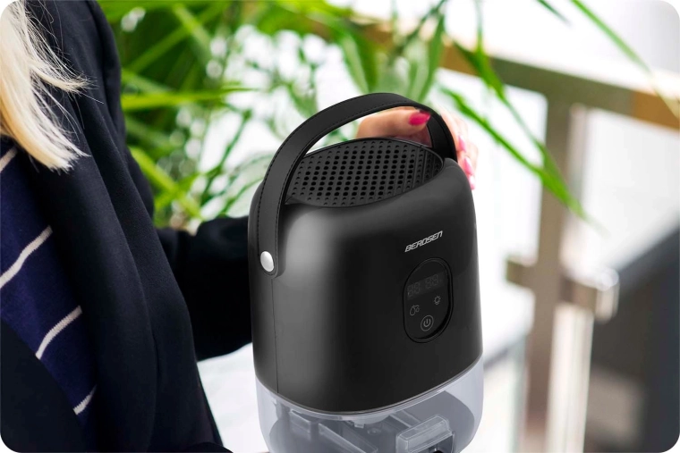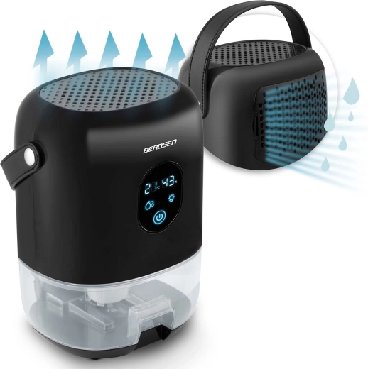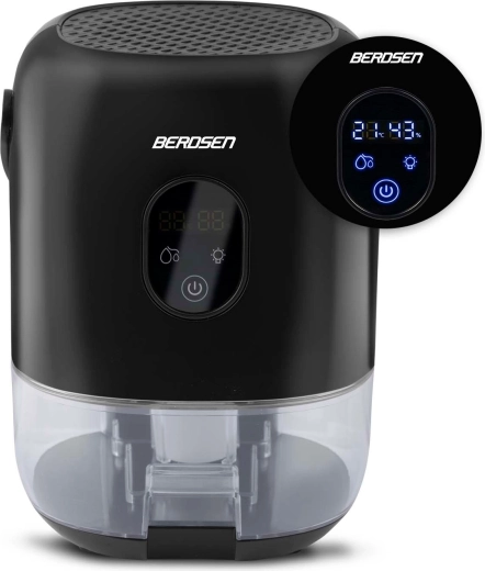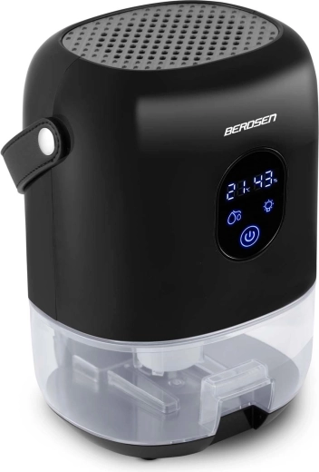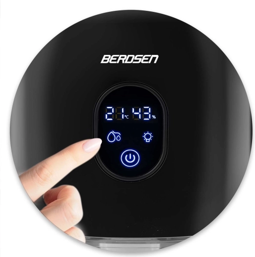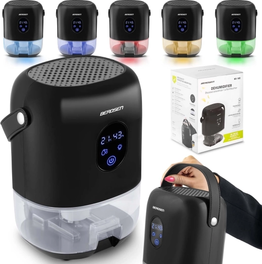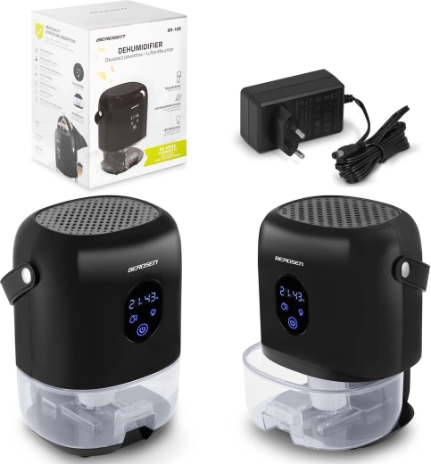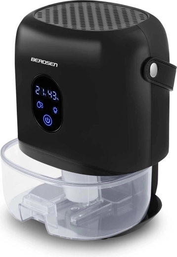 De compacte luchtontvochtiger BERDSEN BR-10B verlaagt effectief de luchtvochtigheid in de kamer, verbetert de luchtkwaliteit en versnelt het drogen van was. Hij biedt stille werking tot 34 dB, laag verbruik van 22,5 W, een grote uitneembare tank van 1000 ml en een overzichtelijk touchdisplay met vochtigheidsindicatie. Het stijlvolle design met LED-verlichting en een praktische leren draaglus past in elk interieur.