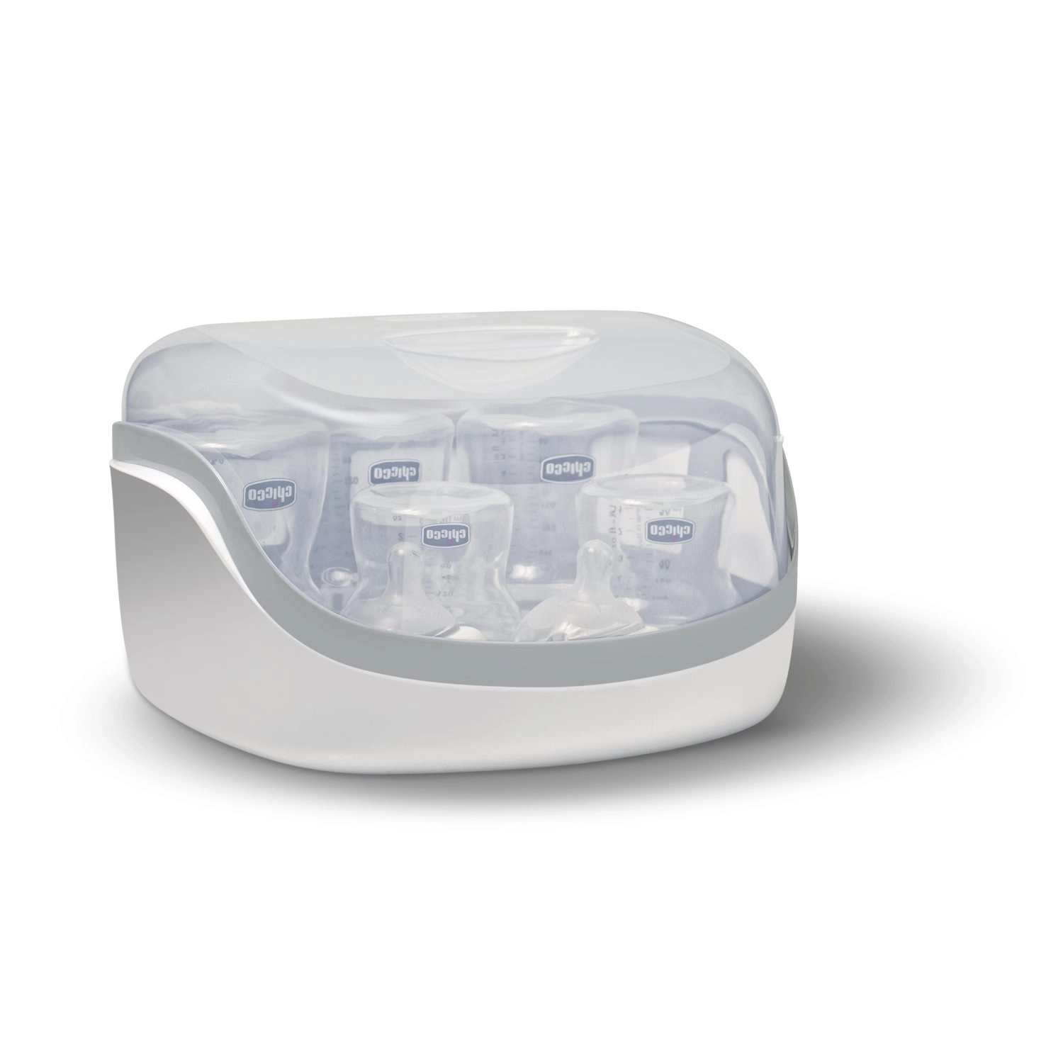 Snelle en veilige sterilisatie van babyflessen en accessoires in enkele minuten direct in de magnetron. Deze compacte CHICCO-sterilisator biedt plaats aan tot 5 flessen en verwijdert tot 99,9% van de bacteriën zonder chemicaliën. Hij is licht en compact, ideaal voor thuis en op reis, en houdt de inhoud tot 24 uur steriel bij gesloten deksel.