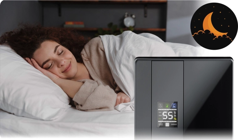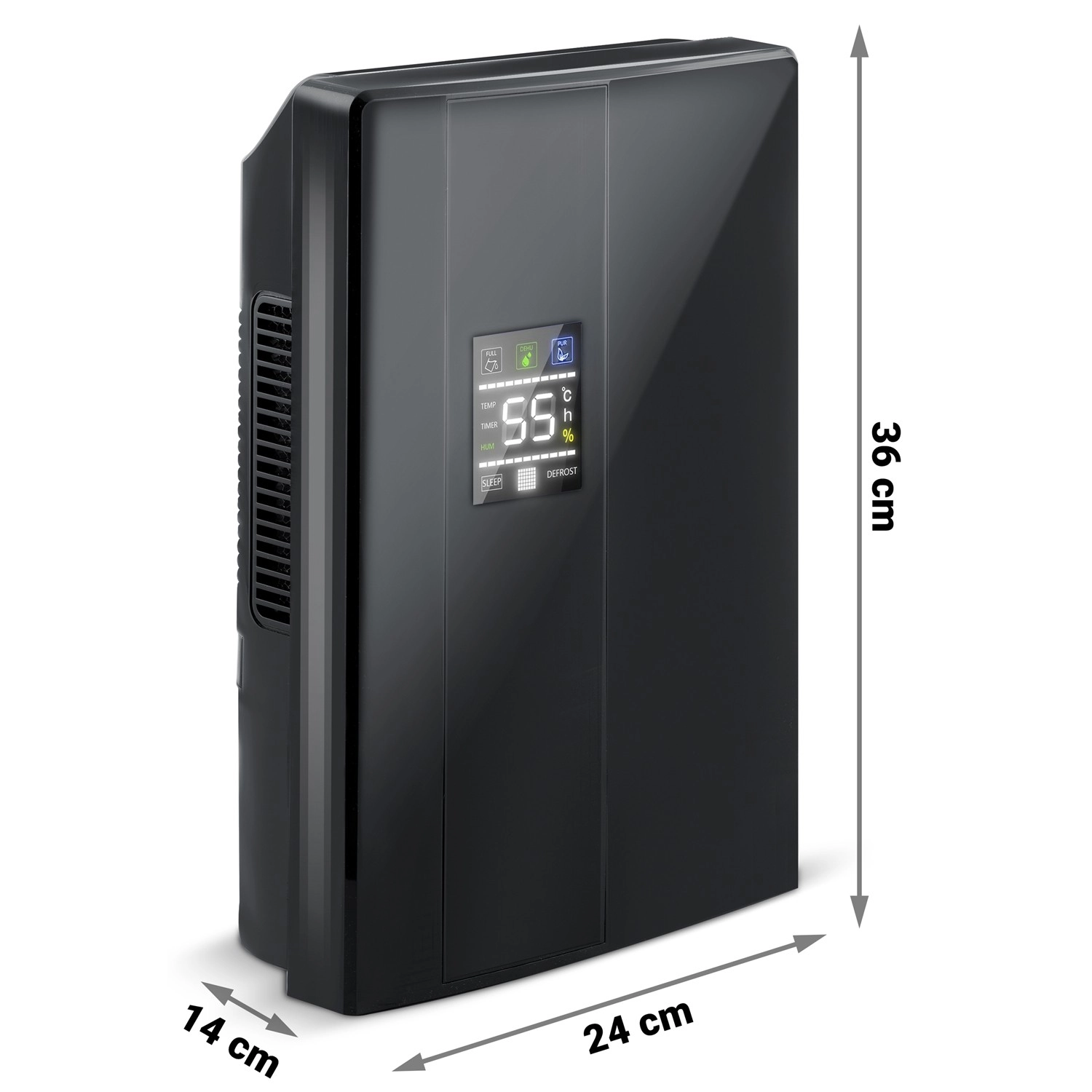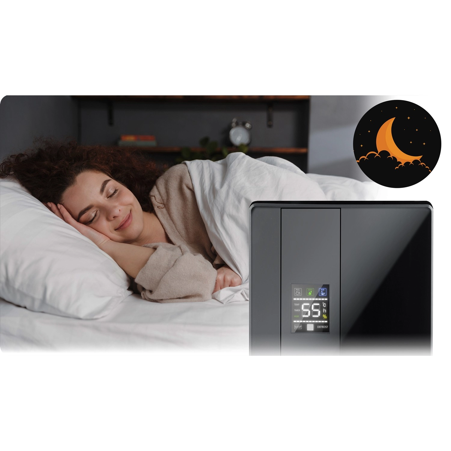 Overzichtelijk LED-display, timer 1–24 u, afstandsbediening en een geluidsniveau van slechts 38 dB. Stel de modus in en laat het apparaat zijn werk doen zonder te storen.