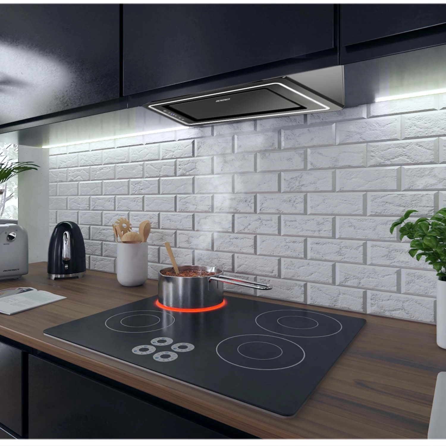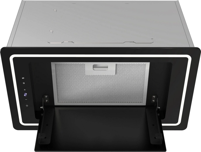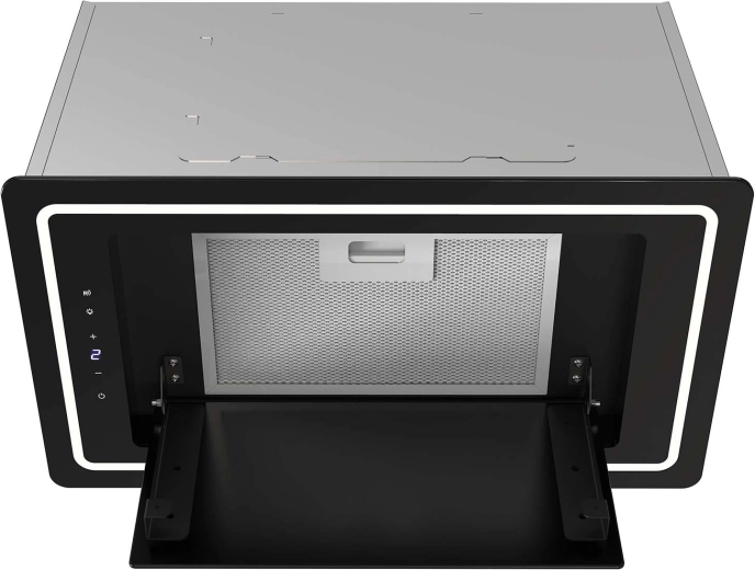 De discrete inbouwconstructie met zwart glazen paneel past perfect in moderne en minimalistische keukens. De afzuigkap absorbeert effectief dampen en geuren, terwijl het 3-laags aluminium vetfilter vet opvangt en keukenmeubels beschermt tegen aanslag. De LED-strip van 5 W verlicht bovendien de kookplaat optimaal voor comfortabel koken.