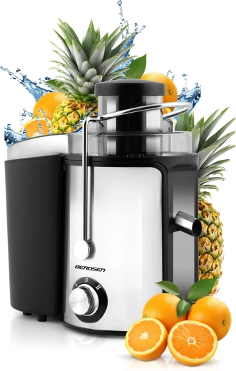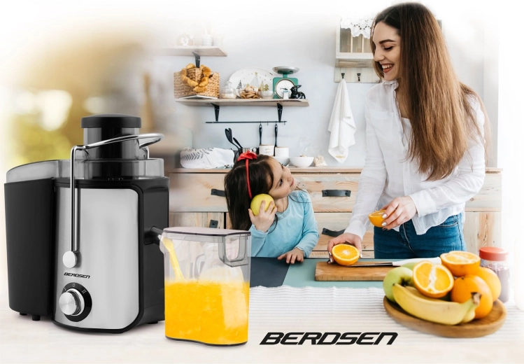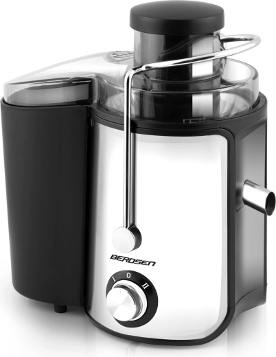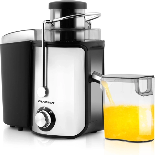 Maak thuis verse sappen vol vitamines met de BERDSEN BD-750 sapcentrifuge. Hij biedt twee snelheden voor fruit en groenten, een krachtige en energiezuinige motor, roestvrijstalen afwerking in combinatie met zwart voor een elegante look, antislipvoetjes voor stabiliteit en eenvoudige reiniging, inclusief onderdelen geschikt voor de vaatwasser. Voor veilig gebruik zorgen een vergrendeling tegen onjuiste montage en oververhittingsbeveiliging.