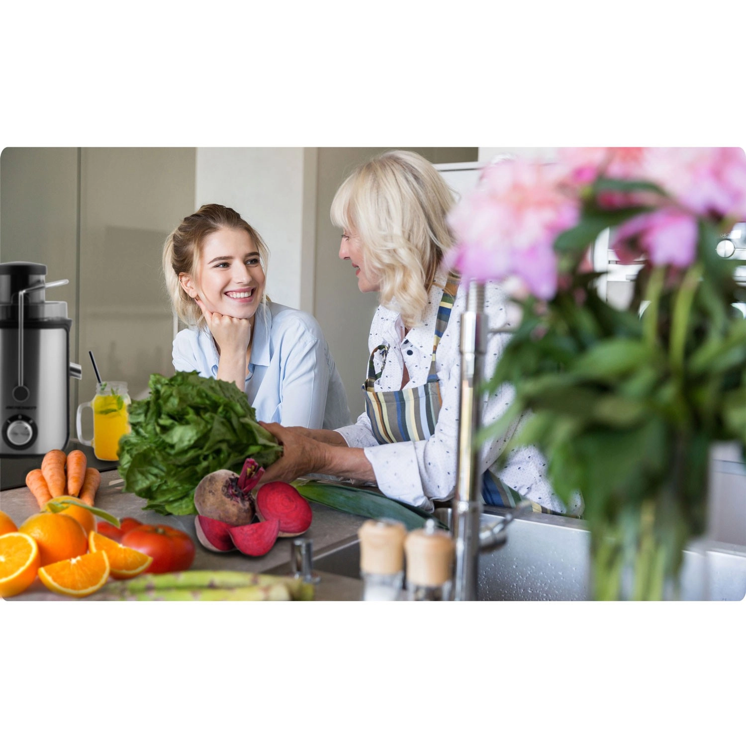 De praktische uitrusting omvat een sapkan van 0,5 l en een pulpcontainer van 1,4 l, een vergrendelende veiligheidsarm en een stabiele basis met rubberen voetjes. Dankzij de compacte afmetingen past hij in elke keuken en het stille geluidsniveau tot 85 dB verstoort de huiselijke rust niet.