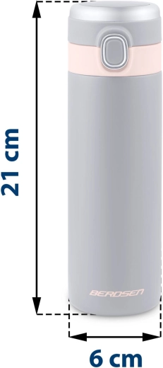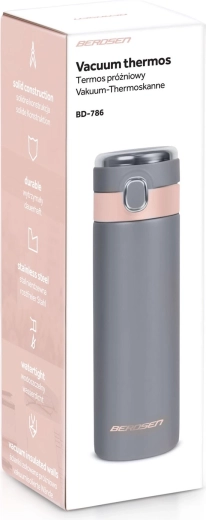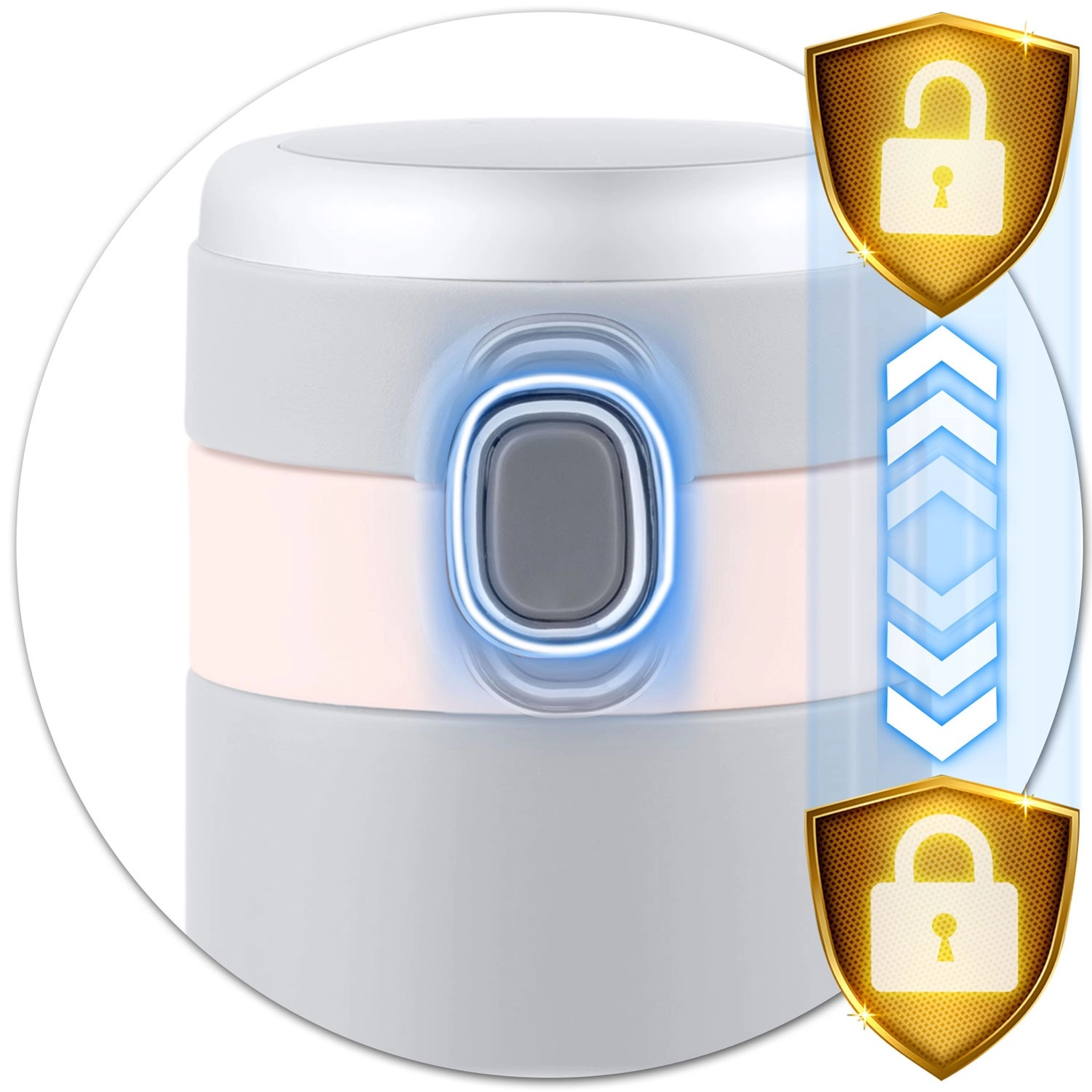 Doordachte details zoals een dekselvergrendeling tegen onbedoeld openen, éénhandig openen met een knop en een schokdempende bodemring tegen storende klappen verhogen het comfort en de levensduur. De thermos is 100% lekdicht, makkelijk mee te nemen en past perfect in de meeste bekerhouders.