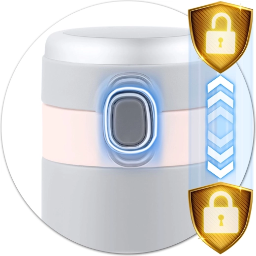 De dekselvergrendeling en afdichtingsmechaniek voorkomen onbedoeld openen in je tas. Openen met één click‑clack-knop.