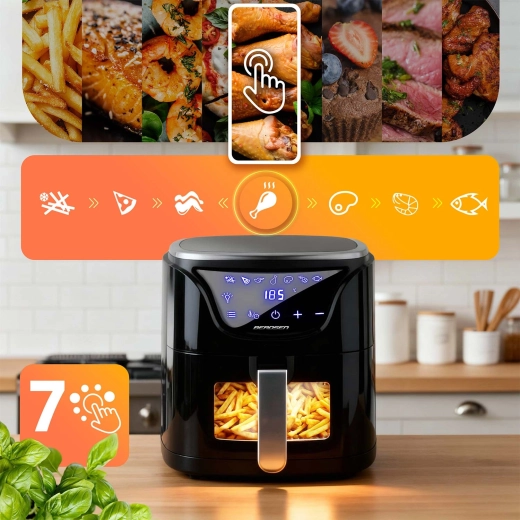 7 voorinstellingen (friet, pizza, kippenvleugels, drumsticks, steak, garnalen, vis)