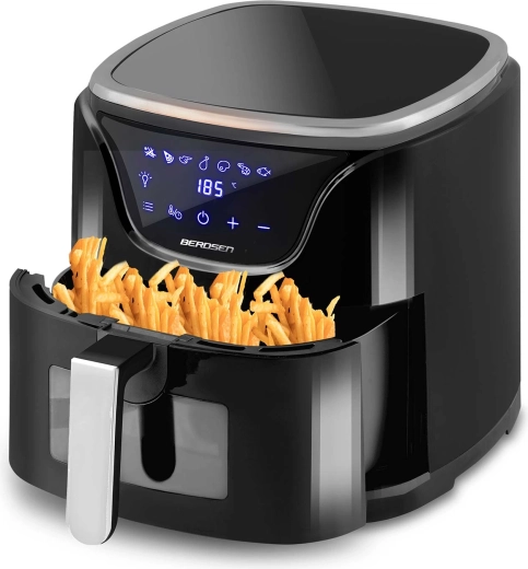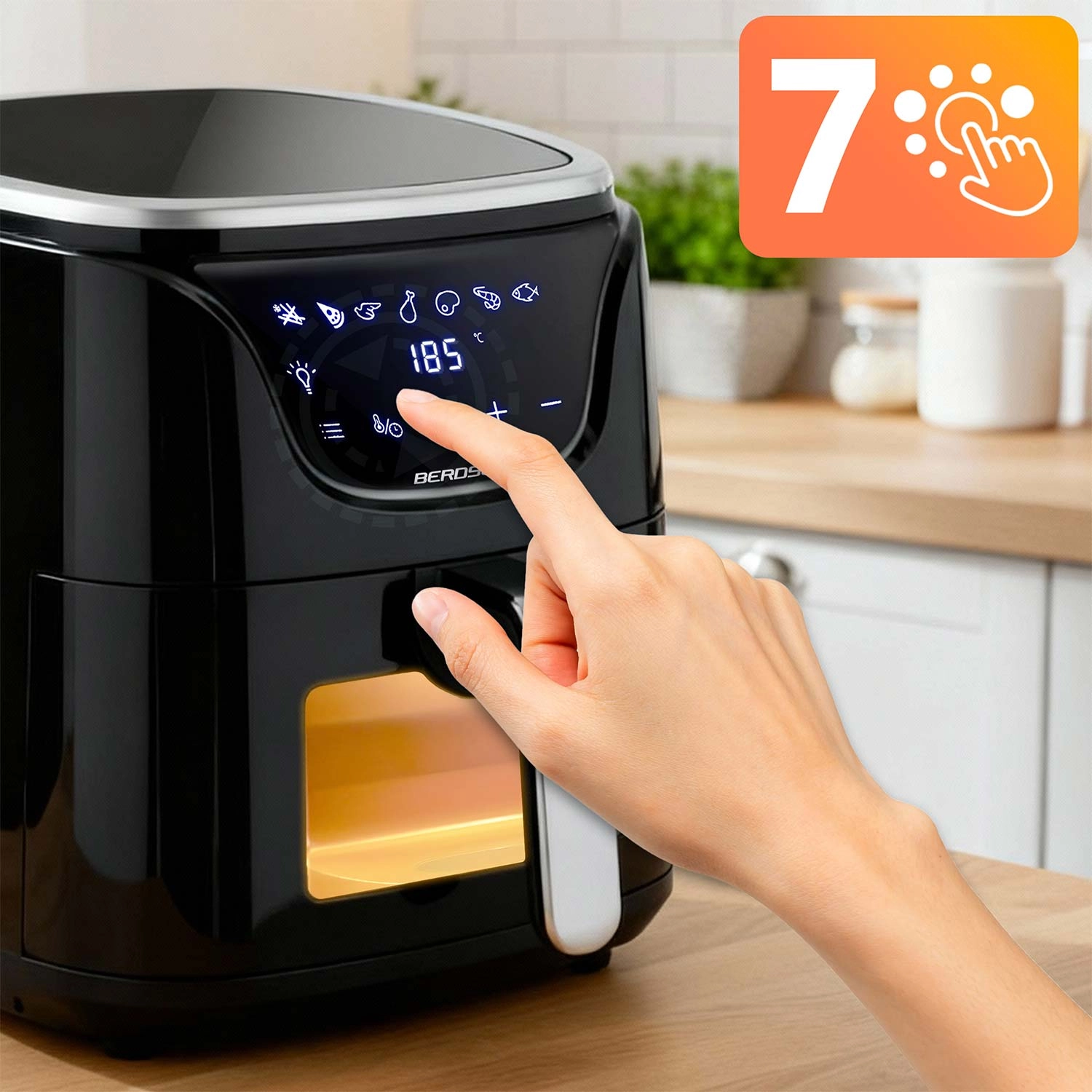 Ontdek gezonder koken met de BERDSEN heteluchtfriteuse 5 l – een compacte hulp voor het hele gezin. Dankzij de circulatie van hete lucht bereid je krokante en sappige gerechten met tot 90% minder vet. Hij biedt 7 automatische programma’s, een touch LED‑paneel met venster om het bakken te controleren, temperatuurregeling tot 200 °C en 1500 W vermogen voor snelle resultaten. Mand en lade zijn vaatwasserbestendig en in de verpakking vind je ook papieren inlegvelletjes gratis.