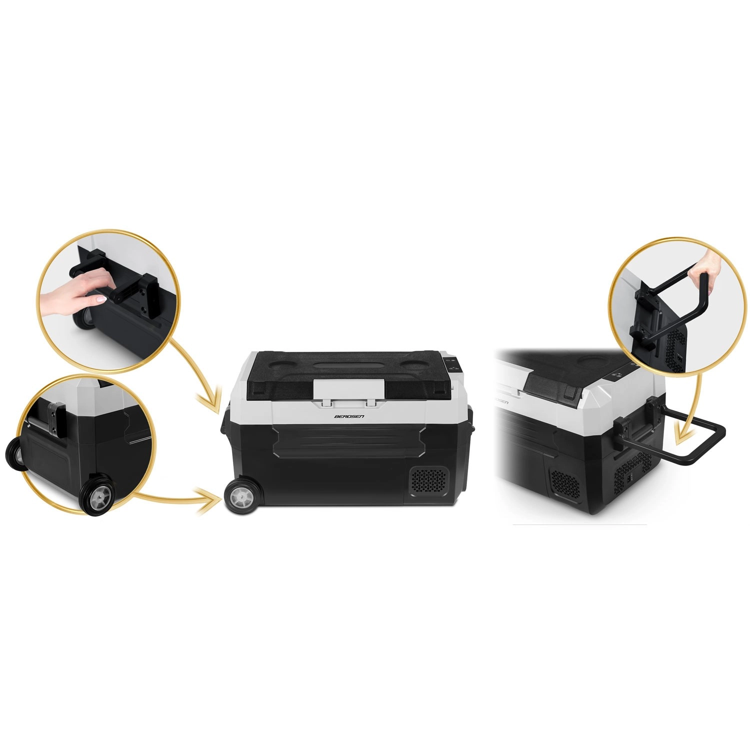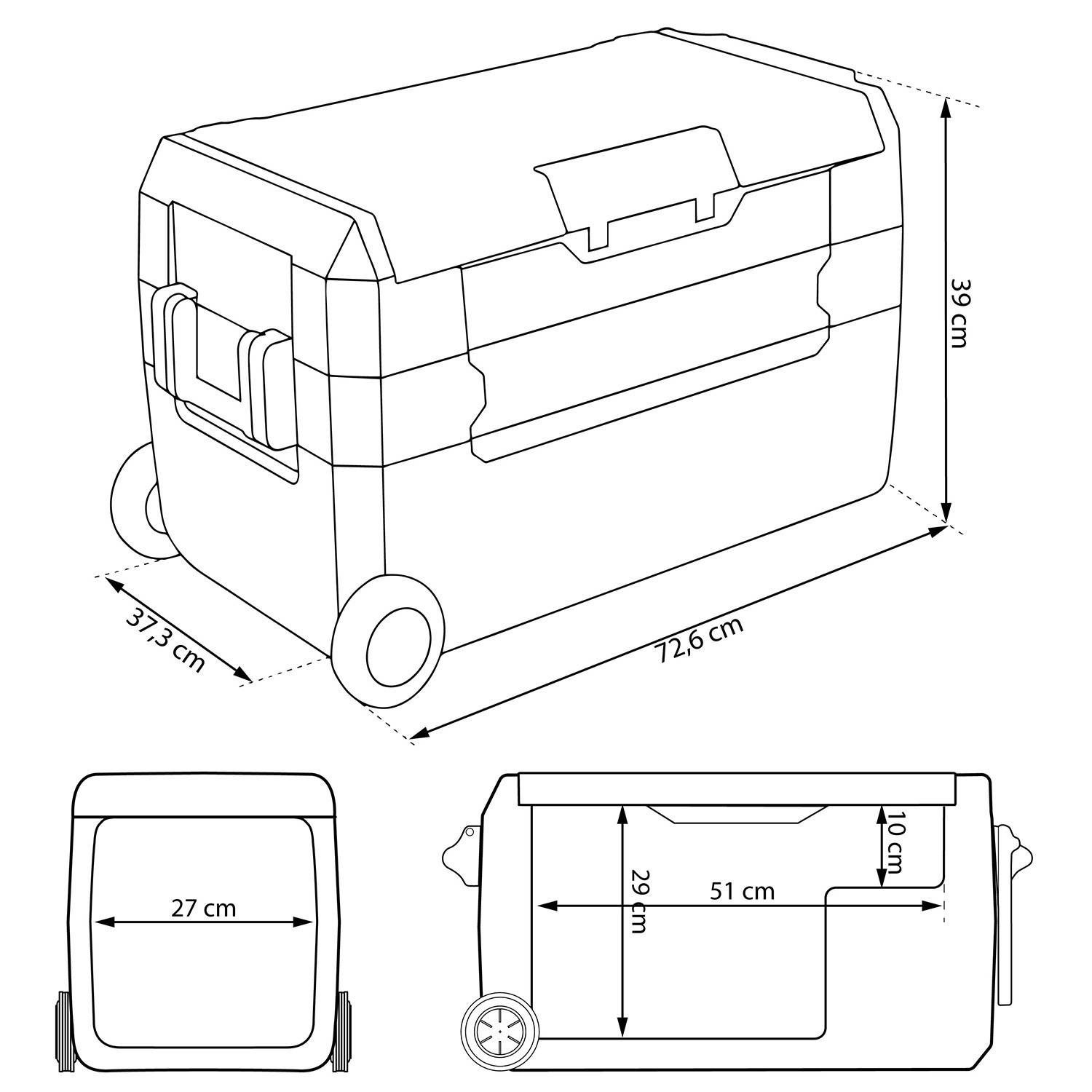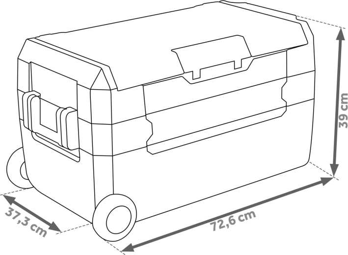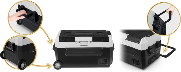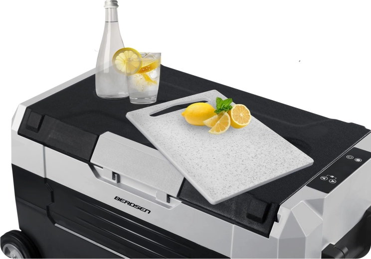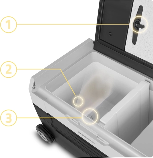 De robuuste constructie met wielen, een verlengde trekstang en zijgrepen zorgt voor comfortabel transport. Het deksel fungeert als werkblad/tafeltje met bekerhouders en er is ook een praktische snijplank inbegrepen. Interne LED-verlichting, een aftapstop voor eenvoudig reinigen en een kinderbeveiliging (child lock) verhogen de veiligheid en het comfort.