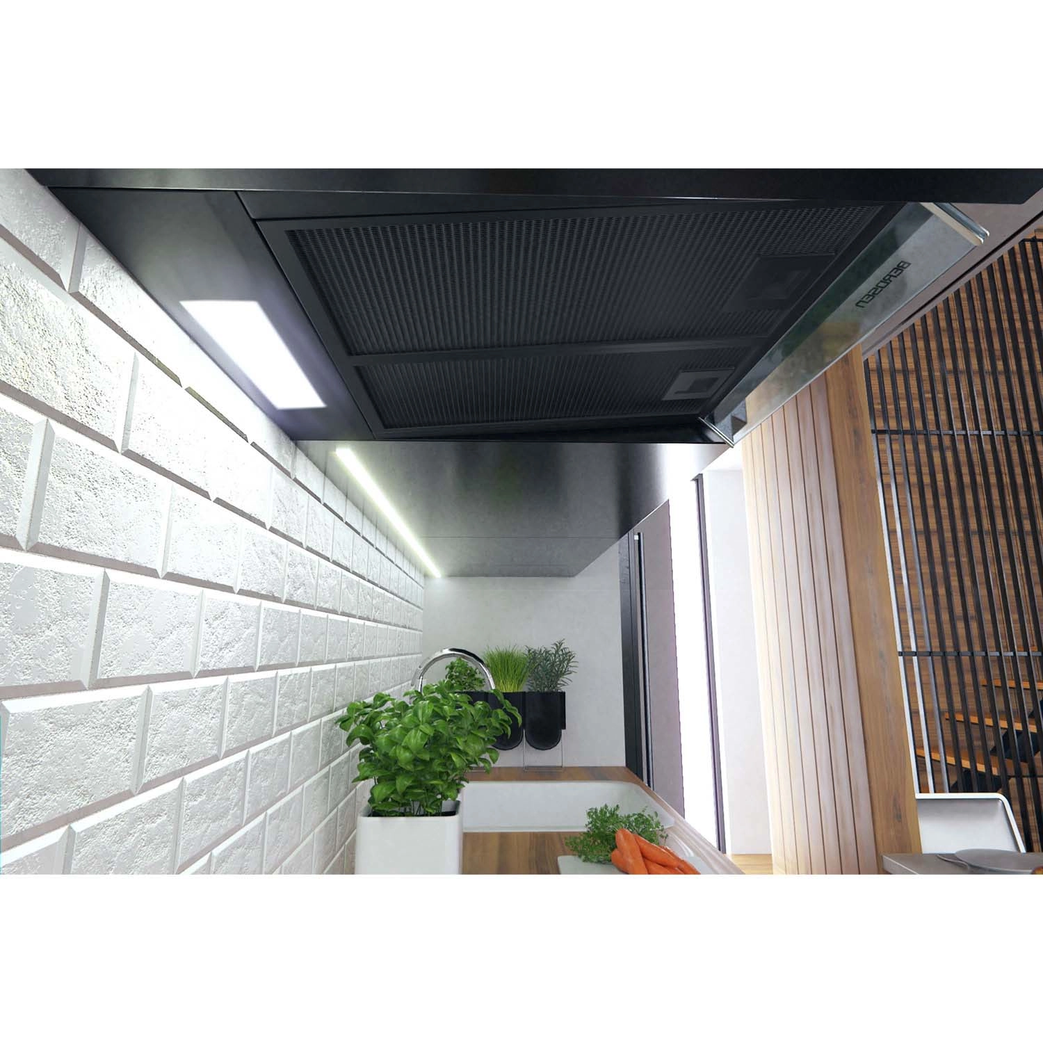 Dankzij het maximale vermogen van 205 m³/u verwijdert hij moeiteloos stoom en geuren bij dagelijks koken. De afzuigkap kan onder een kast of direct aan de muur worden geïnstalleerd en werkt in twee modi – afvoer naar de schouw of recirculatie van lucht via het optionele koolstoffilter Berdsen TYPE-A (niet inbegrepen). Het 5-laags aluminiumfilter is afwasbaar en garandeert langdurige effectiviteit.