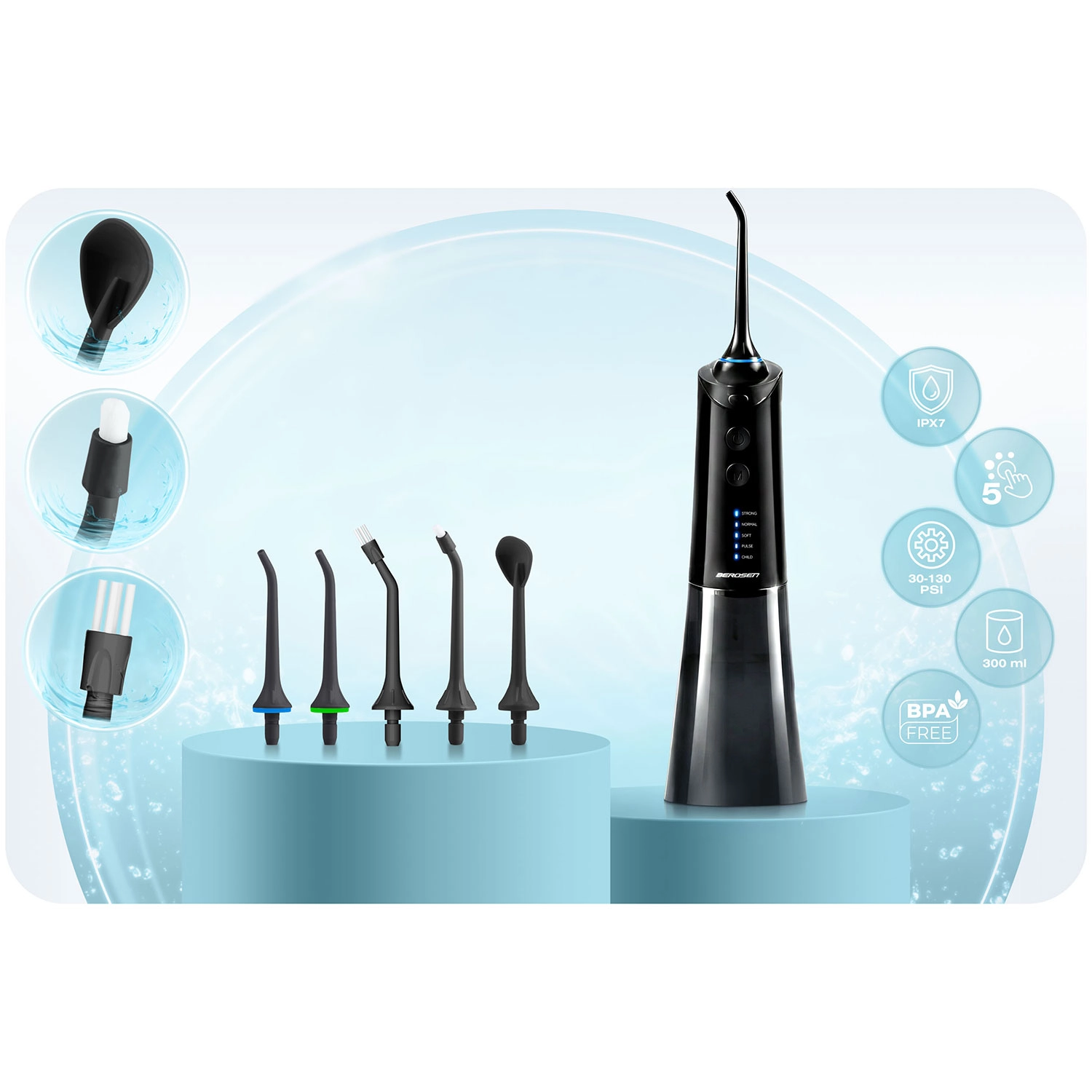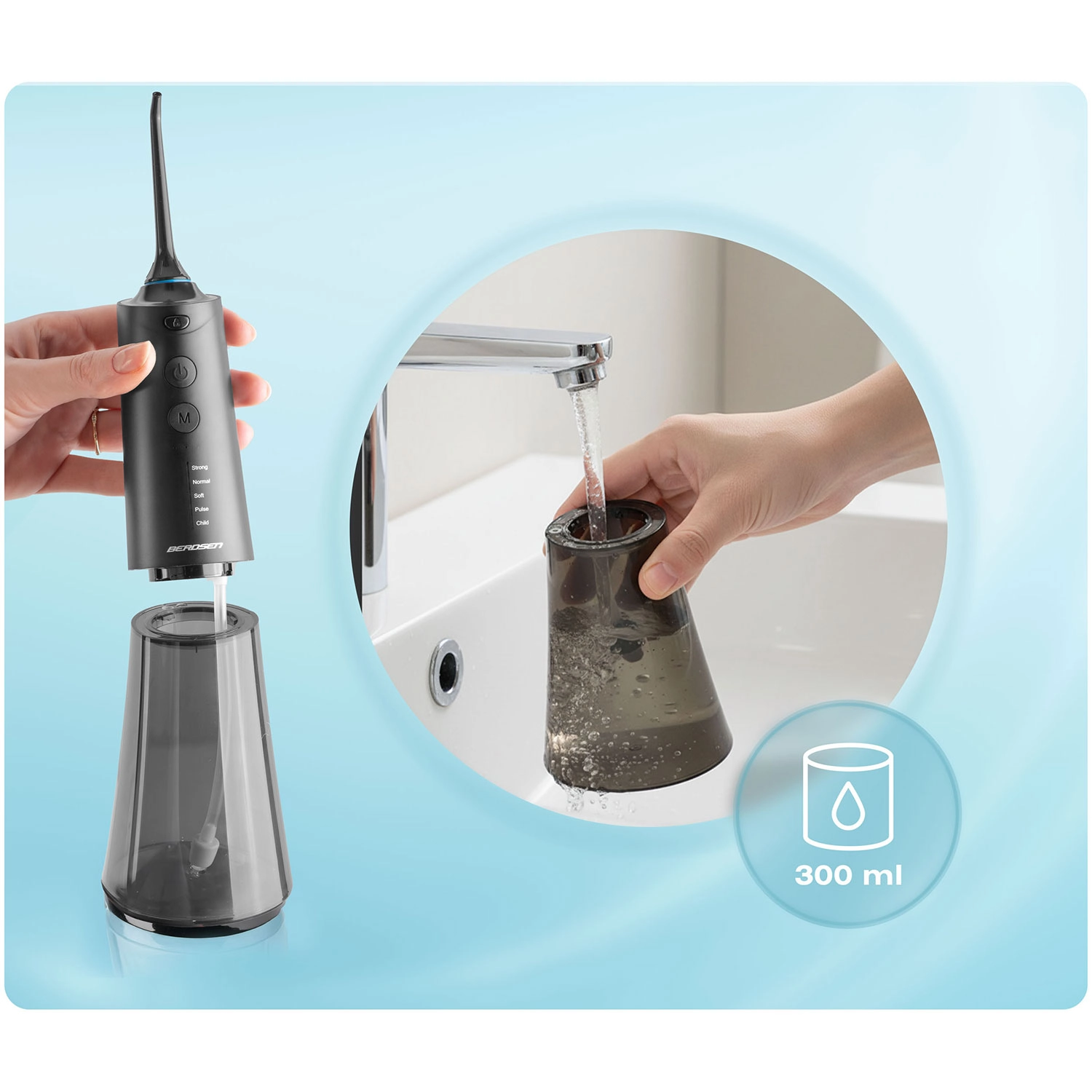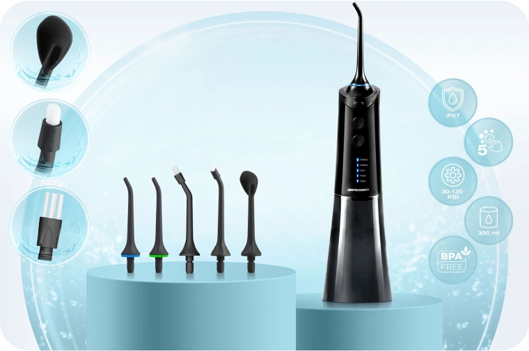 Bereik een grondige maar zachte reiniging van de interdentale ruimtes en de tandvleesrand. De Berdsen‑irrigator combineert krachtige prestaties met comfort: tot 1800 pulsen/min voor effectief wegspoelen van tandplak en voedselresten, vijf werkmodi van zacht tot pulserend en een grote 300 ml tank voor langer gebruik zonder onderbreking.