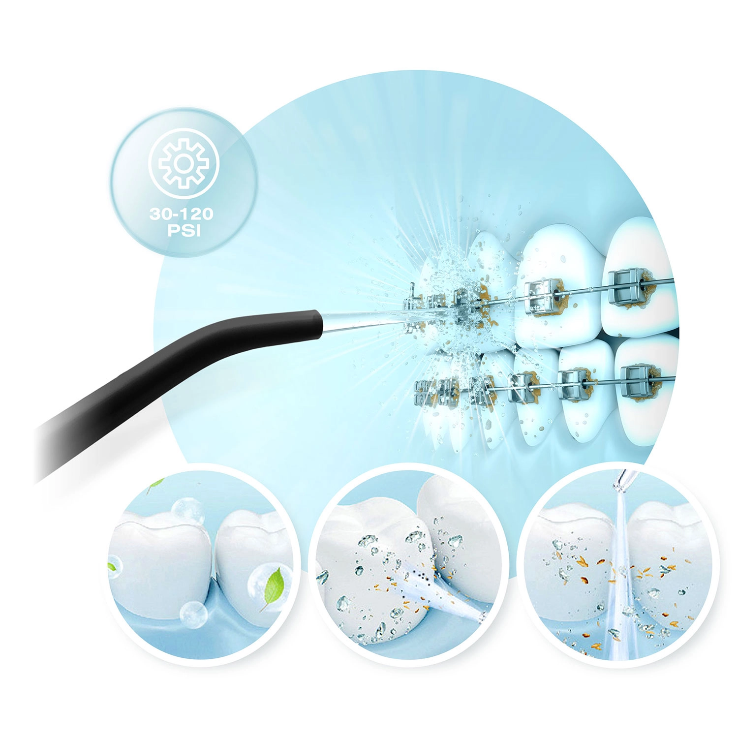 In de doos vindt u 5 opzetstukken voor verschillende behoeften: standaardtips voor dagelijkse irrigatie (2 stuks), een tongopzetstuk voor een frisse adem, een orthodontische tip voor beugels en kronen en een parodontale tip voor het reinigen van diepere pockets (aanbevolen bij lagere druk).