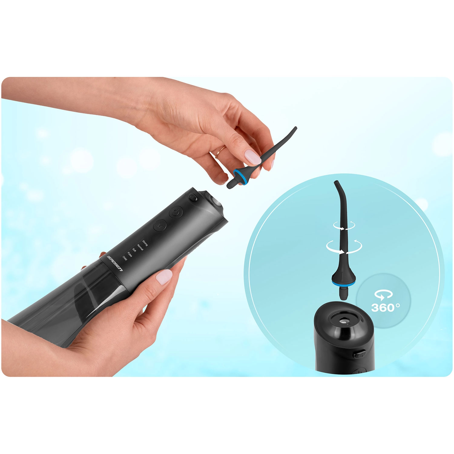 - Comfort en hygiëne: 360° rotatie, eenvoudig wisselen van opzetstukken