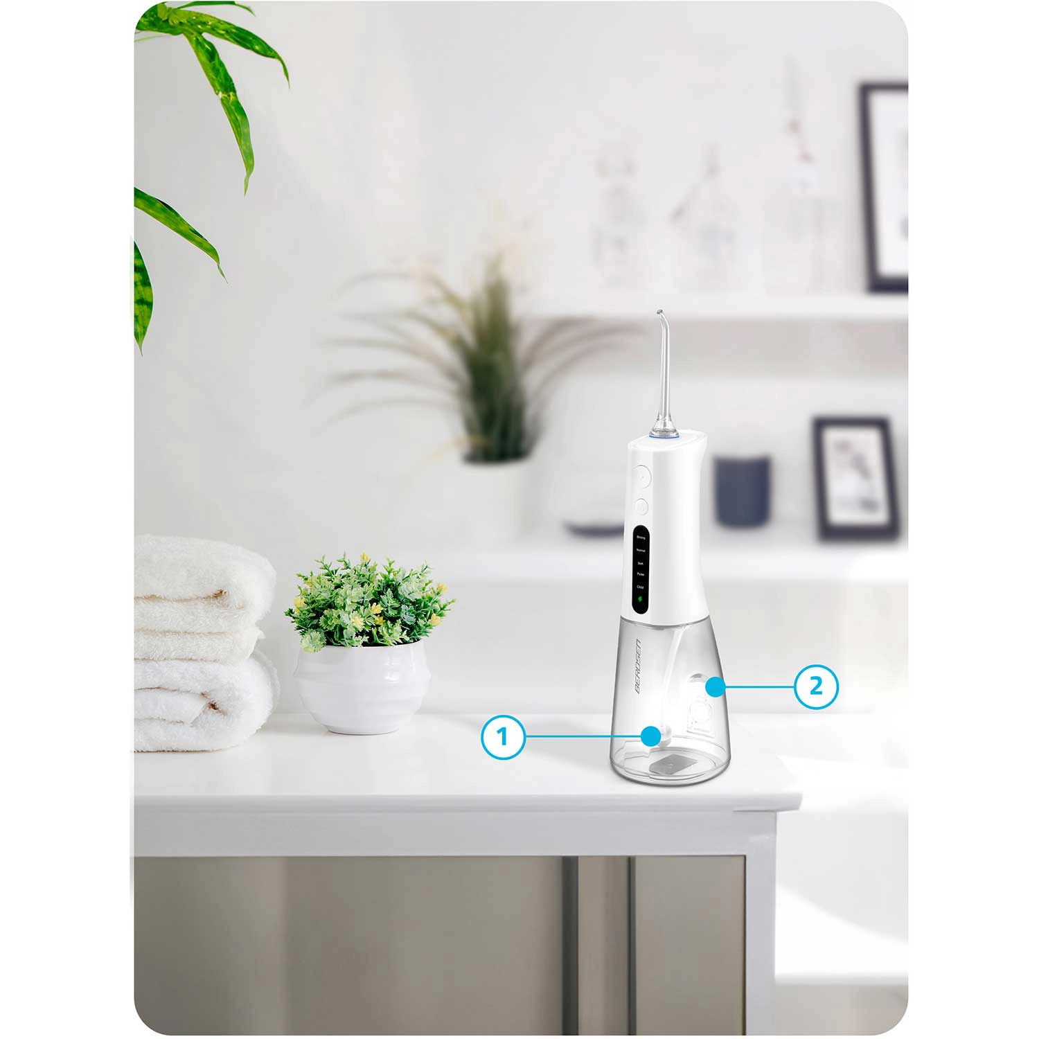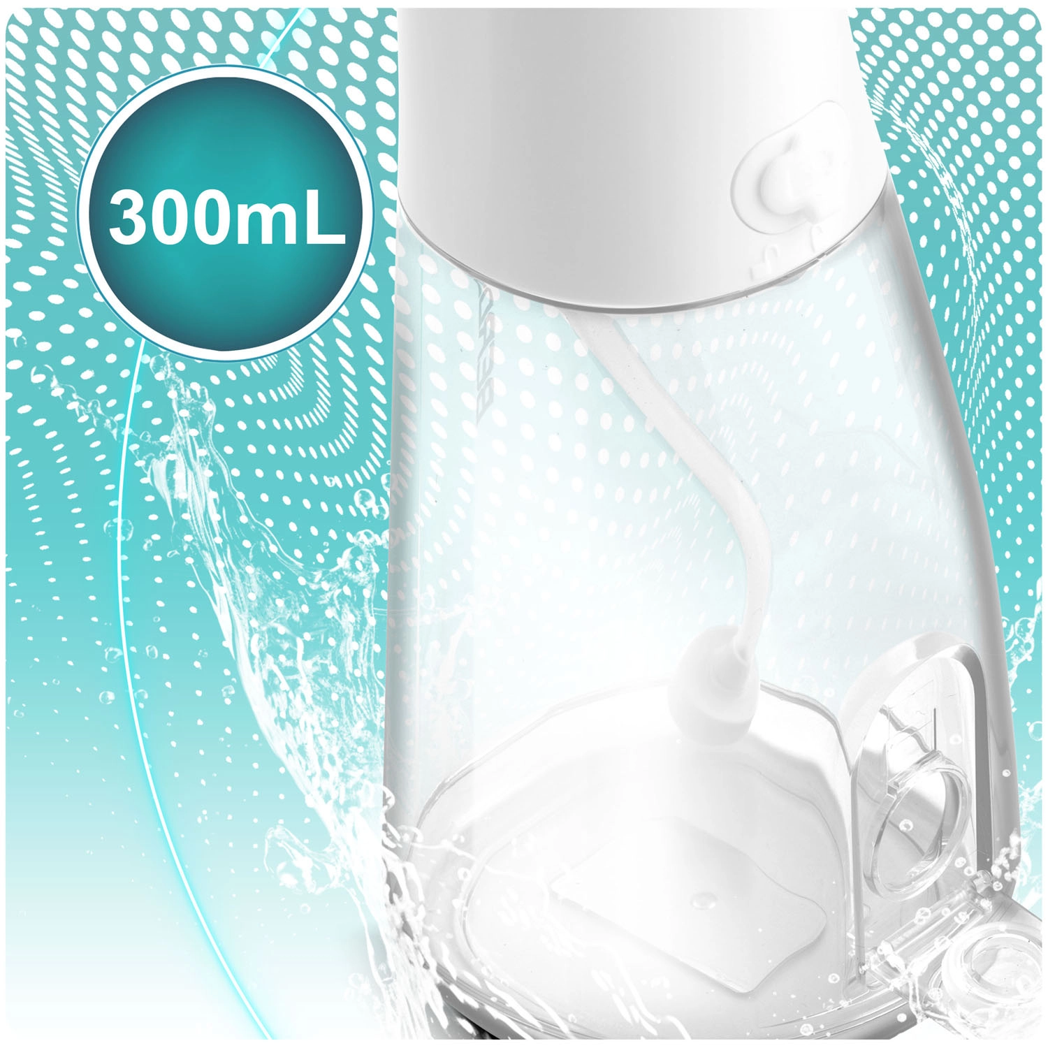Kies uit 5 standen – Strong, Normal, Soft, Child en Pulse – en pas de waterdruk aan jouw behoeften aan. Het grote 300 ml reservoir is voldoende voor volledige irrigatie zonder onderbrekingen, terwijl de 360° draaibare spuitmond toegang tot alle tandvlakken en langs de tandvleesrand vergemakkelijkt. Stille werking ≤72 dB, een timer van 2 minuten en de IPX7 waterdichte constructie maken deze monddouche tot een betrouwbare partner thuis en onderweg.