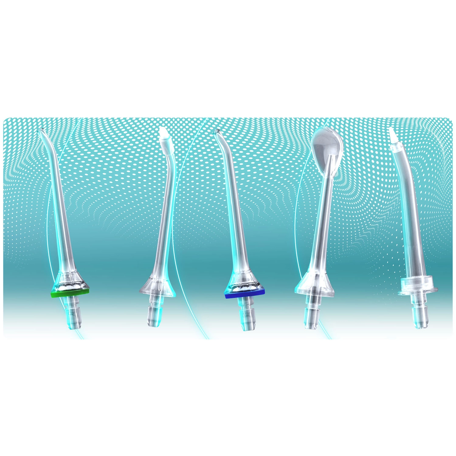 In de set vind je 5 gespecialiseerde spuitmondjes (2 standaard, voor de tong, orthodontisch en voor parodontale pockets), een USB‑C‑kabel en een praktisch etui. De ingebouwde batterij gaat op één lading tot 3–4 weken mee, zodat je altijd een stralende glimlach bij de hand hebt.